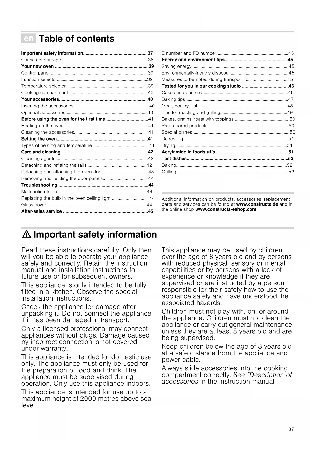 - Retournez après Z du temps de cuisson37 Ú Table of contents [en]Instruction manual Important safety information...................................................37 Causes of damage ..........................................................................38 Your new oven ..........................................................................39 Control panel ....................................................................................39 Function selector..............................................................................39 Temperature selector ......................................................................39 Cooking compartment ....................................................................40 Your accessories......................................................................40 Inserting the accessories ............................................................... 40 Optional accessories ......................................................................40 Before using the oven for the first time..................................41 Heating up the oven........................................................................ 41 Cleaning the accessories............................................................... 41 Setting the oven........................................................................41 Types of heating and temperature ............................................... 41 Care and cleaning ....................................................................42 Cleaning agents ...............................................................................42 Detaching and refitting the rails....................................................42 Detaching and attaching the oven door...................................... 43 Removing and refitting the door panels...................................... 44 Troubleshooting .......................................................................44 Malfunction table..............................................................................44 Replacing the bulb in the oven ceiling light ............................... 44 Glass cover.......................................................................................44 After-sales service ...................................................................45 E number and FD number .............................................................45 Energy and environment tips..................................................45 Saving energy................................................................................... 45 Environmentally-friendly disposal.................................................. 45 Measures to be noted during transport.......................................45 Tested for you in our cooking studio .....................................46 Cakes and pastries .........................................................................46 Baking tips ........................................................................................47 Meat, poultry, fish.............................................................................48 Tips for roasting and grilling..........................................................49 Bakes, gratins, toast with toppings .............................................. 50 Preprepared products..................................................................... 50 Special dishes .................................................................................. 50 Defrosting ..........................................................................................51 Drying.................................................................................................51 Acrylamide in foodstuffs .........................................................51 Test dishes................................................................................52 Baking................................................................................................52 Grilling................................................................................................ 52 Produktinfo Additional information on products, accessories, replacement parts and services can be found at www.constructa.de and in the online shop www.constructa-eshop.com : Important safety information Read these instructions carefully. Only then will you be able to operate your appliance safely and correctly. Retain the instruction manual and installation instructions for future use or for subsequent owners. This appliance is only intended to be fully fitted in a kitchen. Observe the special installation instructions. Check the appliance for damage after unpacking it. Do not connect the appliance if it has been damaged in transport. Only a licensed professional may connect appliances without plugs. Damage caused by incorrect connection is not covered under warranty. This appliance is intended for domestic use only. The appliance must only be used for the preparation of food and drink. The appliance must be supervised during operation. Only use this appliance indoors. This appliance is intended for use up to a maximum height of 2000 metres above sea level. This appliance may be used by children over the age of 8 years old and by persons with reduced physical, sensory or mental capabilities or by persons with a lack of experience or knowledge if they are supervised or are instructed by a person responsible for their safety how to use the appliance safely and have understood the associated hazards. Children must not play with, on, or around the appliance. Children must not clean the appliance or carry out general maintenance unless they are at least 8 years old and are being supervised. Keep children below the age of 8 years old at a safe distance from the appliance and power cable. Always slide accessories into the cooking compartment correctly. See "Description of accessories in the instruction manual.38 Risk of fire!