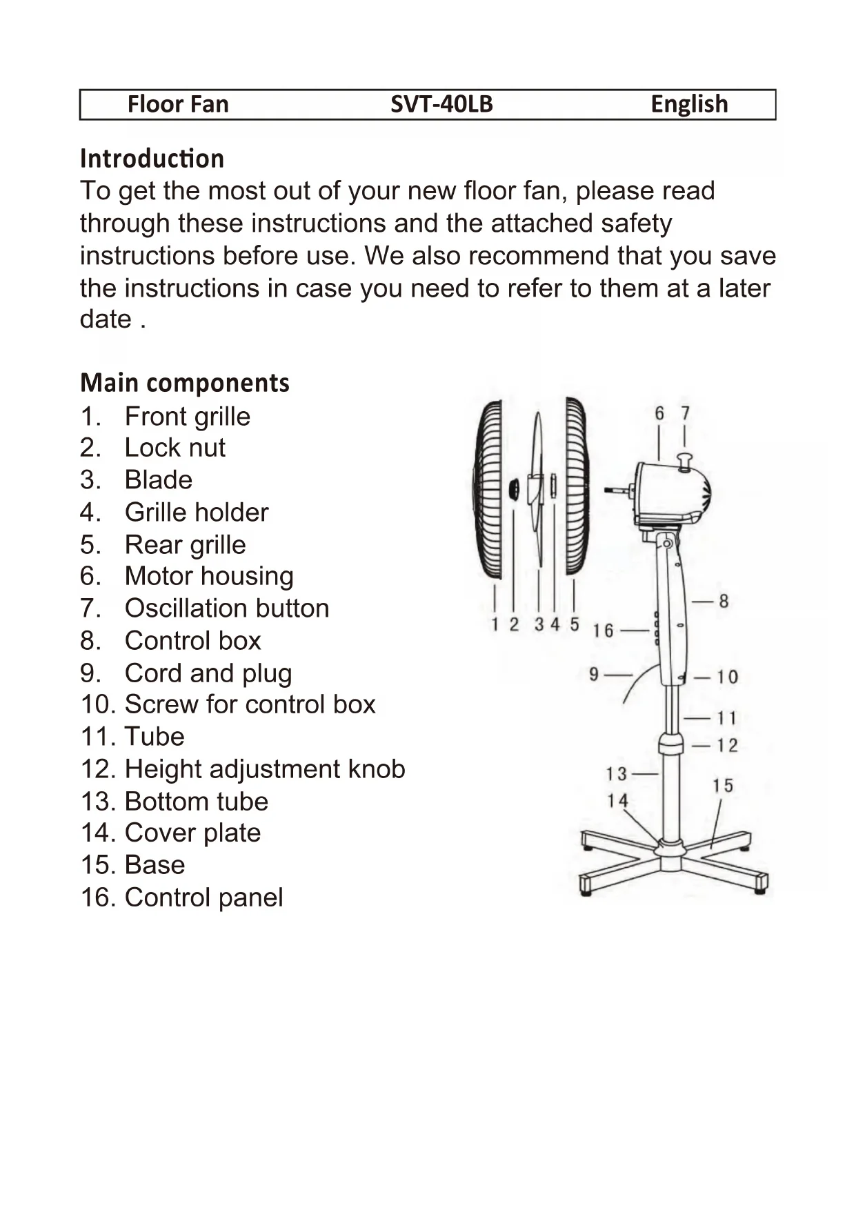 to be exposed to water. ODD% in storage, it is important to keep it in a safe and dry location. It is also important to protect the fan head from dust. We strongly recommend using the original box when storing the fan. Assembly - Insert the bottom tube (13) into the base (15). Attach the cover plate (14). - Insert the tube (11) into the bottom tube (13). Attach the contorl box (8) to the tube (11) and secure using the screw (10). Set the floor fan to the required depth and tighten the height adjustment knob. - Push the rear grille (5) in towards the motor and secure using the grille holder (4). - Push the blade (3) onto the spindle. Secure the blade with the lock nut (2). - Hook the front grille (1) onto the rear grille (5) and tighten them together. Use - Plug the floor fan in. - Turn the floor fan on and off by pressing the buttons on the fan's control panel. - Switch the turning function on or off using the oscillation button (7) on top of the motor housing.TECHNICAL DATA Voltage: 220-240V~50/60Hz Power: 45 W Waste Management The symbol above and on the product means that the product is classed as Electrical or Electronic equipment and should not be disposed with other household or commercial waste at the end of its useful life. The Waste of Electrical and Electronic Equipment (WEEE) _[{%%D products using best available recovery and recycling techniques to minimise the impact on the environment, treat any hazardous substances and avoid the increasing landfill. Contact local authorities for information on the correct disposal of Electrical or Electronic equipment.%!"LB &