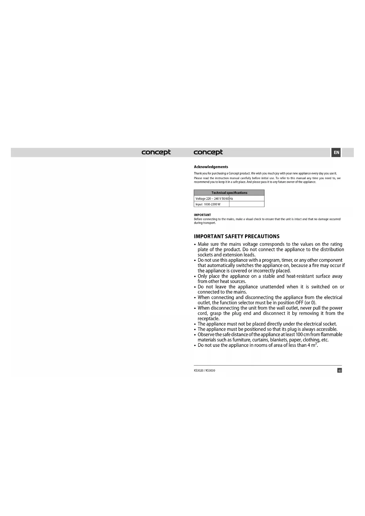 Acknowledgements Thank you for purchasing a Concept product. We wish you much joy with your new appliance every day you use it. Please read the instruction manual carefully before initial use. To refer to this manual any time you need to, we recommend you to keep it in a safe place. And please pass it to any future owner of the appliance. Technical specifications Voltage 220 ~ 240 V 50/60 Hz Input 1830-2200 W IMPORTANT Before connecting to the mains, make a visual check to ensure that the unit is intact and that no damage occurred during transport.