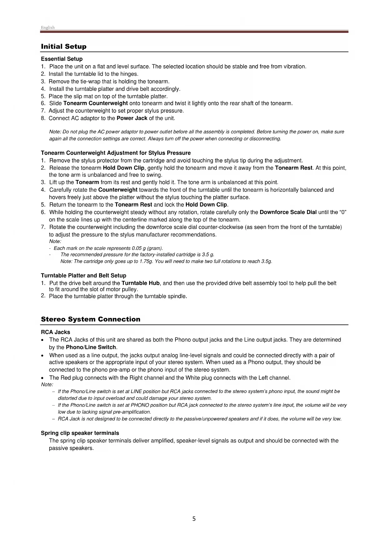 Stereo System Connection RCA Jacks The RCA Jacks of this unit are shared as both the Phono output jacks and the Line output jacks. They are determined by the Phono/Line Switch. When used as a line output, the jacks output analog line-level signals and could be connected directly with a pair of active speakers or the appropriate input of your stereo system. When used as a Phono output, they should be connected to the phono pre-amp or the phono input of the stereo system. The Red plug connects with the Right channel and the White plug connects with the Left channel. Note: If the Phono/Line switch is set at LINE position but RCA jacks connected to the stereo system’s phono input, the sound might be distorted due to input overload and could damage your stereo system. If the Phono/Line switch is set at PHONO position but RCA jack connected to the stereo system’s line input, the volume will be very low due to lacking signal pre-amplification. RCA Jack is not designed to be connected directly to the passive/unpowered speakers and if it does, the volume will be very low. Spring clip speaker terminals The spring clip speaker terminals deliver amplified, speaker-level signals as output and should be connected with the passive speakers.English