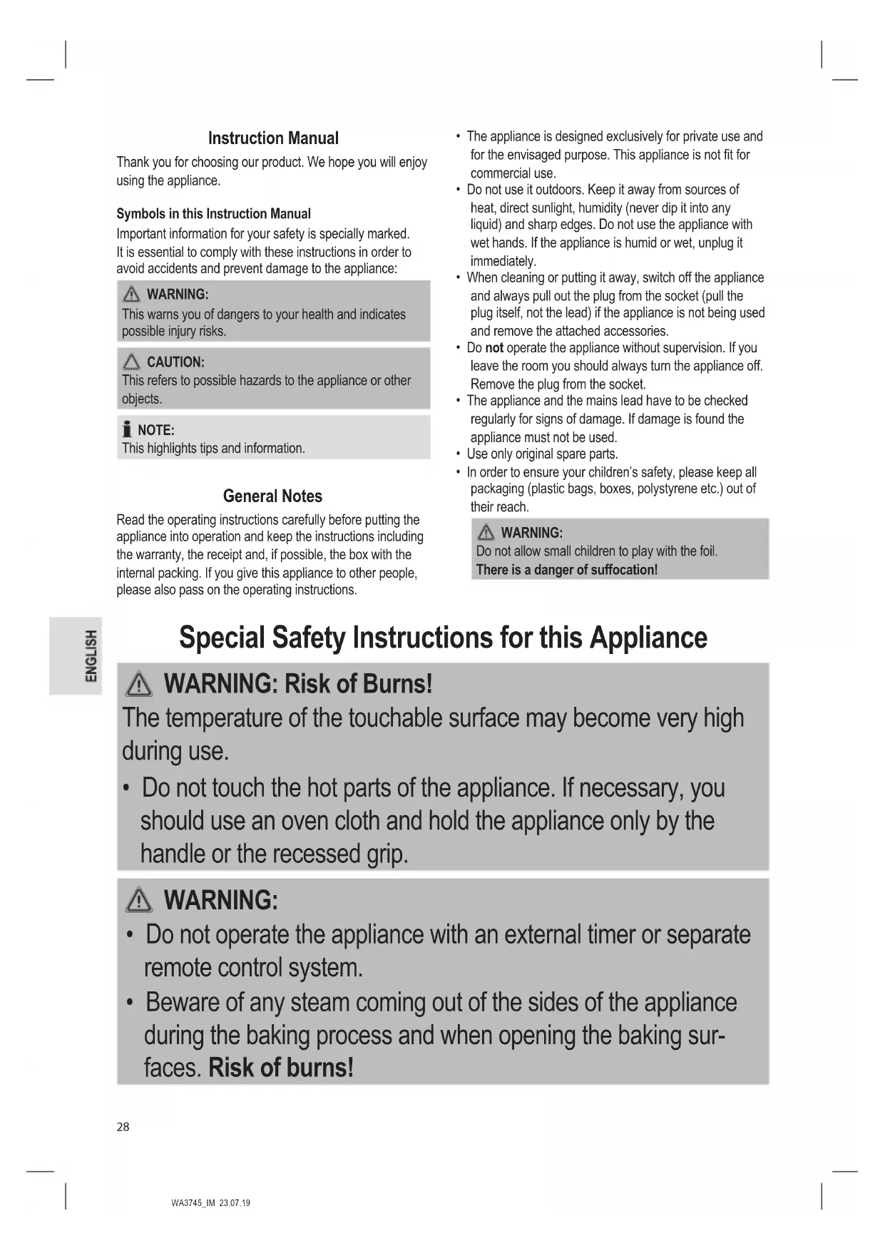 - Beware of any steam coming out of the sides of the appliance during the baking process and when opening the baking sur- faces. Risk of burns!WA3745_IM 23.07.19