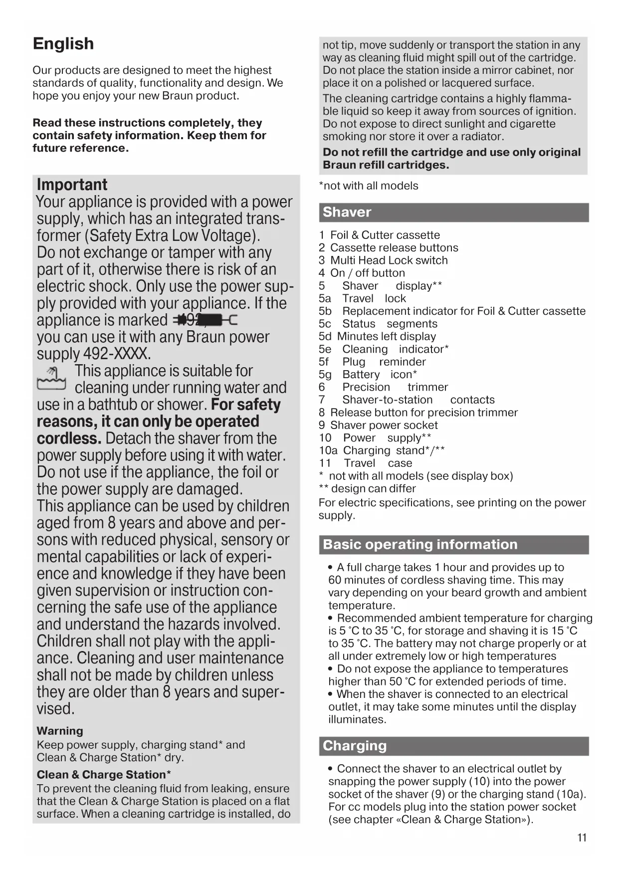 Der Verbrauch der Reinigungsflüssigkeit ist merklich erhöht. Der Abfluss der Reinigungsstation ist verstopft. – Reinigen Sie den Abfluss unter Zuhilfe- nahme eines Holzzahnstochers. – Wischen Sie die Wanne der Reinigungs- station regelmäßig aus. 91611492_93XXcc_W&D_MN_Type_5793_S6-76.indd 1091611492_93XXcc_W&D_MN_Type_5793_S6-76.indd 10 20.10.17 08:1620.10.17 08:16 CSS APPROVED Effective Date 23Oct2017 GMT - Printed 22Nov2017 Page 10 of 7611 English Our products are designed to meet the highest standards of quality, functionality and design. We hope you enjoy your new Braun product. Read these instructions completely, they contain safety information. Keep them for future reference. Important Your appliance is provided with a power supply, which has an integrated trans- former (Safety Extra Low Voltage). Do not exchange or tamper with any part of it, otherwise there is risk of an electric shock. Only use the power sup- ply provided with your appliance. If the appliance is marked 492, you can use it with any Braun power supply 492-XXXX. This appliance is suitable for cleaning under running water and use in a bathtub or shower. For safety reasons, it can only be operated cordless. Detach the shaver from the power supply before using it with water. Do not use if the appliance, the foil or the power supply are damaged. This appliance can be used by children aged from 8 years and above and per- sons with reduced physical, sensory or mental capabilities or lack of experi- ence and knowledge if they have been given supervision or instruction con- cerning the safe use of the appliance and understand the hazards involved. Children shall not play with the appli- ance. Cleaning and user maintenance shall not be made by children unless they are older than 8 years and super- vised. Warning Keep power supply, charging stand* and Clean & Charge Station* dry. Clean & Charge Station* To prevent the cleaning fluid from leaking, ensure that the Clean & Charge Station is placed on a flat surface. When a cleaning cartridge is installed, do not tip, move suddenly or transport the station in any way as cleaning fluid might spill out of the cartridge. Do not place the station inside a mirror cabinet, nor place it on a polished or lacquered surface. The cleaning cartridge contains a highly flamma- ble liquid so keep it away from sources of ignition. Do not expose to direct sunlight and cigarette smoking nor store it over a radiator. Do not refill the cartridge and use only original Braun refill cartridges. *not with all models Shaver 1 Foil & Cutter cassette 2 Cassette release buttons 3 Multi Head Lock switch 4 On / off button 5 Shaver display** 5a Travel lock