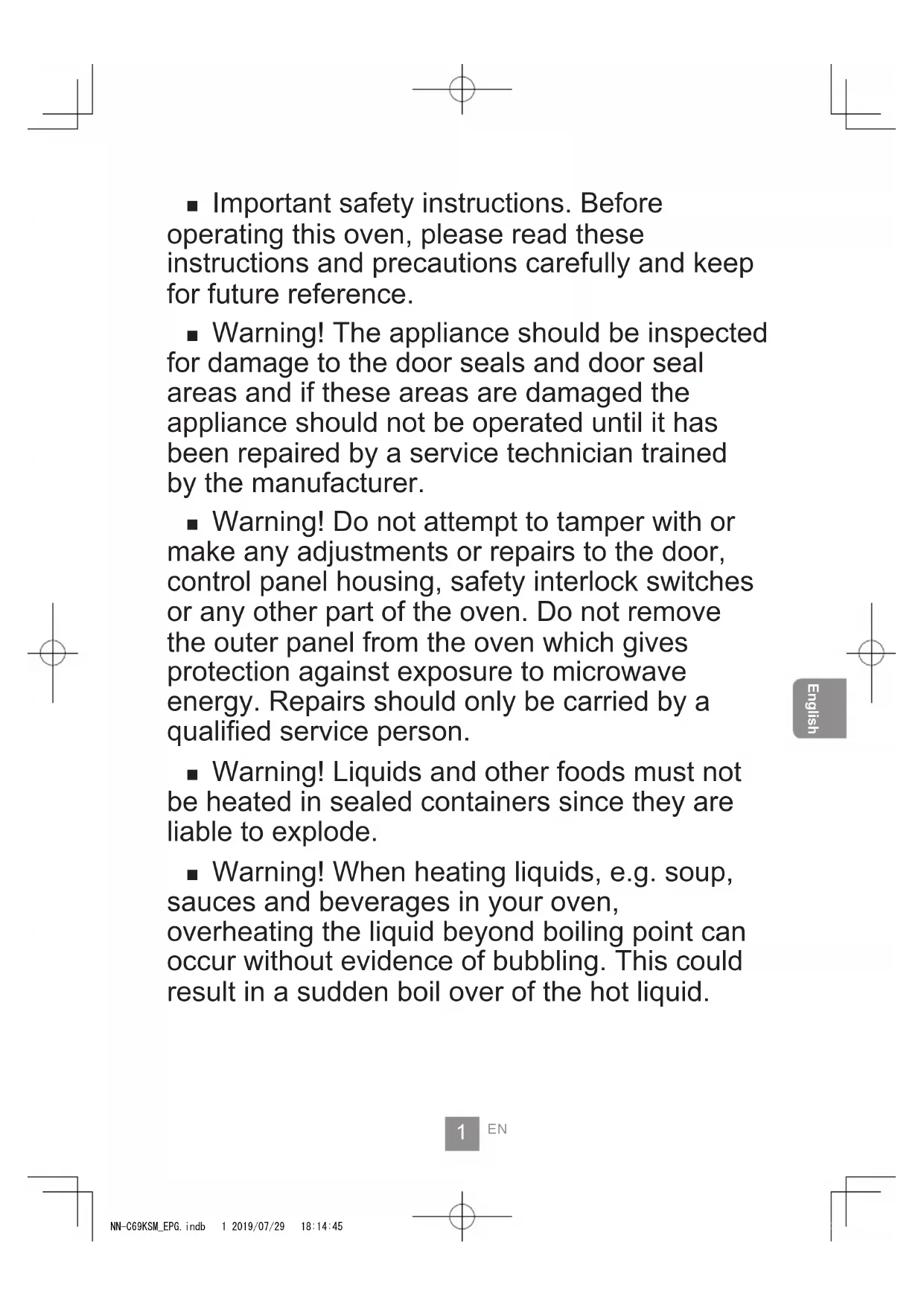 English Important safety instructions. Before operating this oven, please read these instructions and precautions carefully and keep for future reference. Warning! The appliance should be inspected for damage to the door seals and door seal areas and if these areas are damaged the appliance should not be operated until it has been repaired by a service technician trained by the manufacturer. Warning! Do not attempt to tamper with or make any adjustments or repairs to the door, control panel housing, safety interlock switches or any other part of the oven. Do not remove the outer panel from the oven which gives protection against exposure to microwave energy. Repairs should only be carried by a qualied service person. Warning! Liquids and other foods must not be heated in sealed containers since they are liable to explode. Warning! When heating liquids, e.g. soup, sauces and beverages in your oven, overheating the liquid beyond boiling point can occur without evidence of bubbling. This could result in a sudden boil over of the hot liquid. NN-C69KSM_EPG.indb 1 2019/07/29 18:14:452