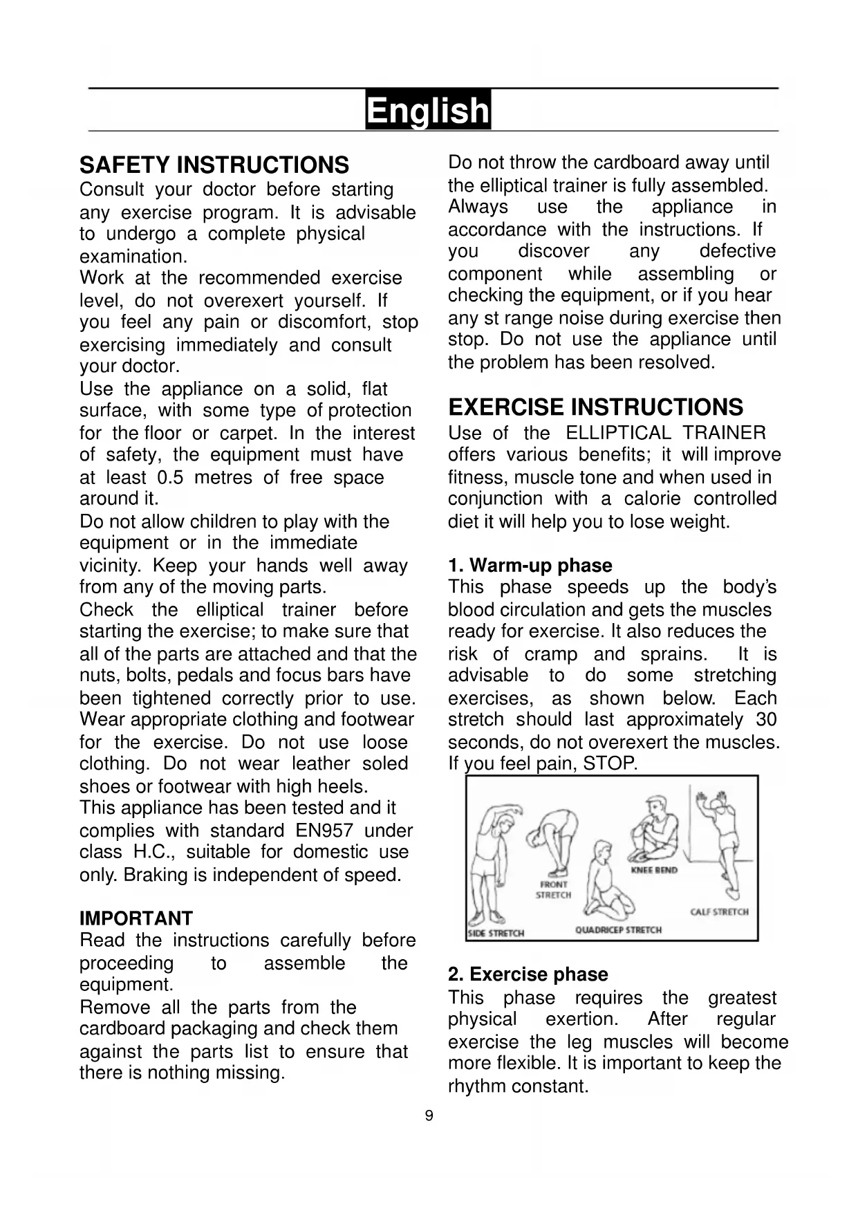 English SAFETY INSTRUCTIONS Consult your doctor before starting any exercise program. It is advisable to undergo a complete physical examination. Work at the recommended exercise level, do not overexert yourself. If you feel any pain or discomfort, stop exercising immediately and consult your doctor. Use the appliance on a solid, flat surface, with some type of protection for the floor or carpet. In the interest of safety, the equipment must have at least 0.5 metres of free space around it. Do not allow children to play with the equipment or in the immediate vicinity. Keep your hands well away from any of the moving parts. Check the elliptical trainer before starting the exercise; to make sure that all of the parts are attached and that the nuts, bolts, pedals and focus bars have been tightened correctly prior to use. Wear appropriate clothing and footwear for the exercise. Do not use loose clothing. Do not wear leather soled shoes or footwear with high heels. This appliance has been tested and it complies with standard EN957 under class H.C., suitable for domestic use only. Braking is independent of speed. IMPORTANT Read the instructions carefully before proceeding to assemble the equipment. Remove all the parts from the cardboard packaging and check them against the parts list to ensure that there is nothing missing. Do not throw the cardboard away until the elliptical trainer is fully assembled. Always use the appliance in accordance with the instructions. If you discover any defective component while assembling or checking the equipment, or if you hear any st range noise during exercise then stop. Do not use the appliance until the problem has been resolved. EXERCISE INSTRUCTIONS Use of the ELLIPTICAL TRAINER offers various benefits; it will improve fitness, muscle tone and when used in conjunction with a calorie controlled diet it will help you to lose weight.