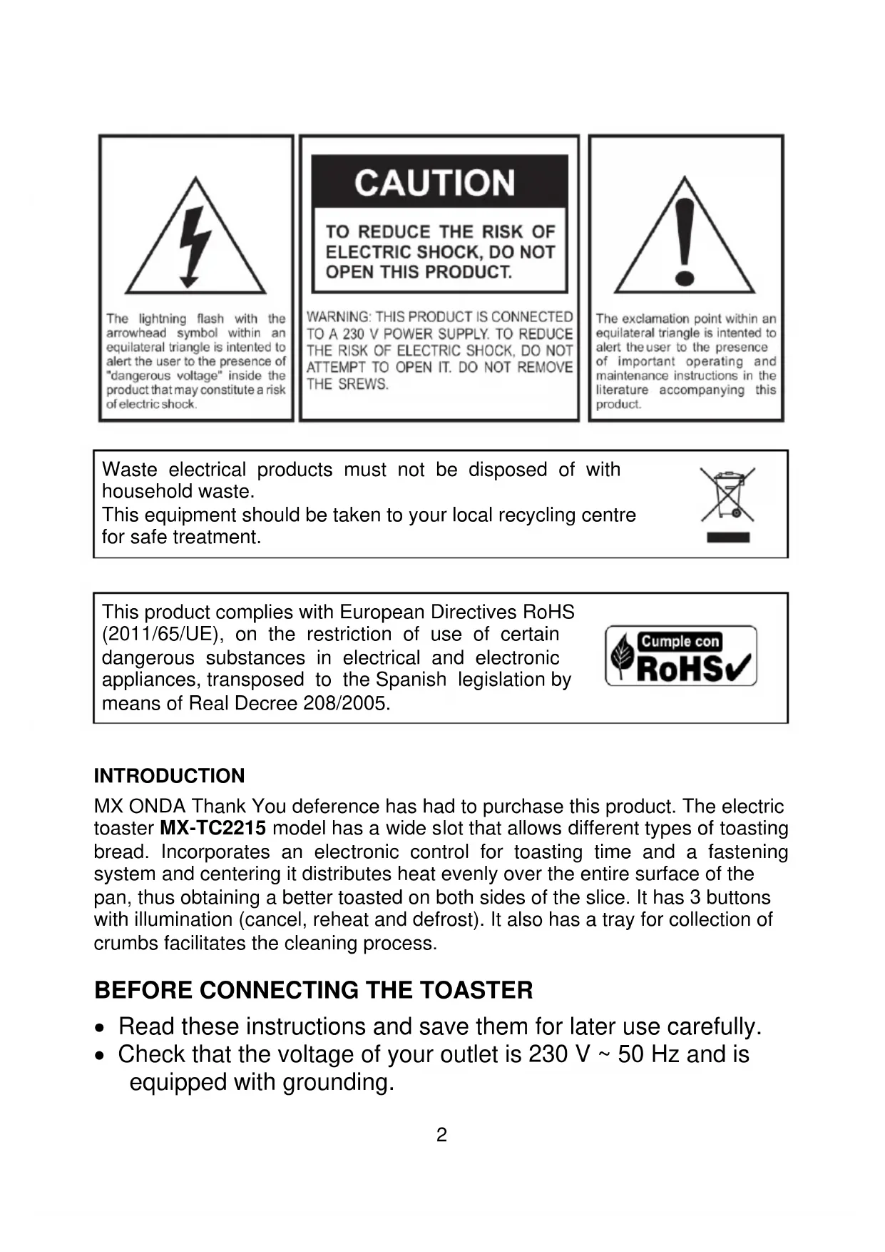 - Check that the voltage of your outlet is 230 V ~ 50 Hz and is equipped with grounding. Waste electrical products must not be disposed of with household waste. This equipment should be taken to your local recycling centre for safe treatment. This product complies with European Directives RoHS (2011/65/UE), on the restriction of use of certain dangerous substances in electrical and electronic appliances, transposed to the Spanish legislation by means of Real Decree 208/2005.3