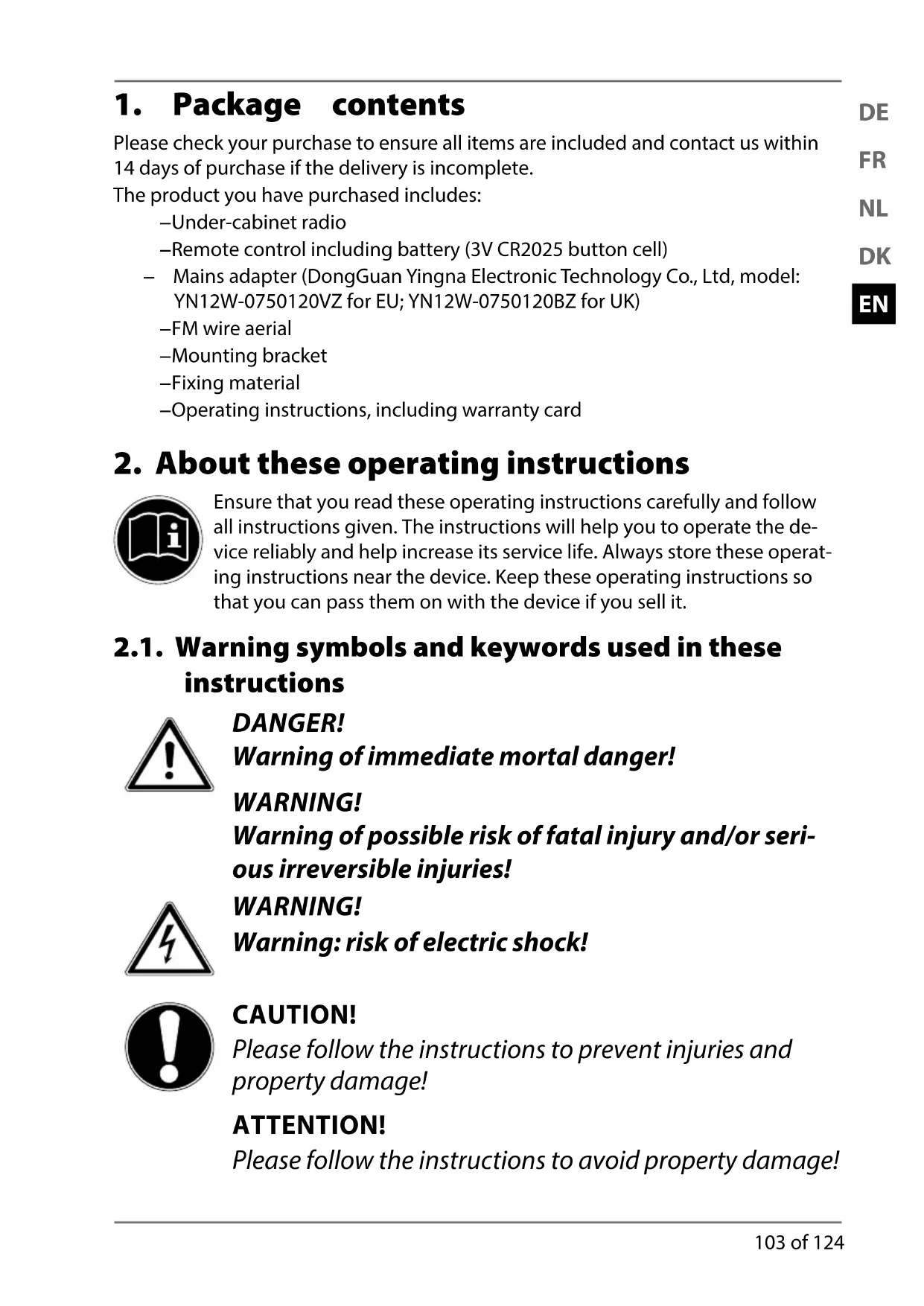 Please check your purchase to ensure all items are included and contact us within 14 days of purchase if the delivery is incomplete. The product you have purchased includes: − Under-cabinet radio − Remote control including battery (3V CR2025 button cell) − Mains adapter (DongGuan Yingna Electronic Technology Co., Ltd, model: YN12W-0750120VZ for EU; YN12W-0750120BZ for UK) − FM wire aerial − Mounting bracket − Fixing material − Operating instructions, including warranty card