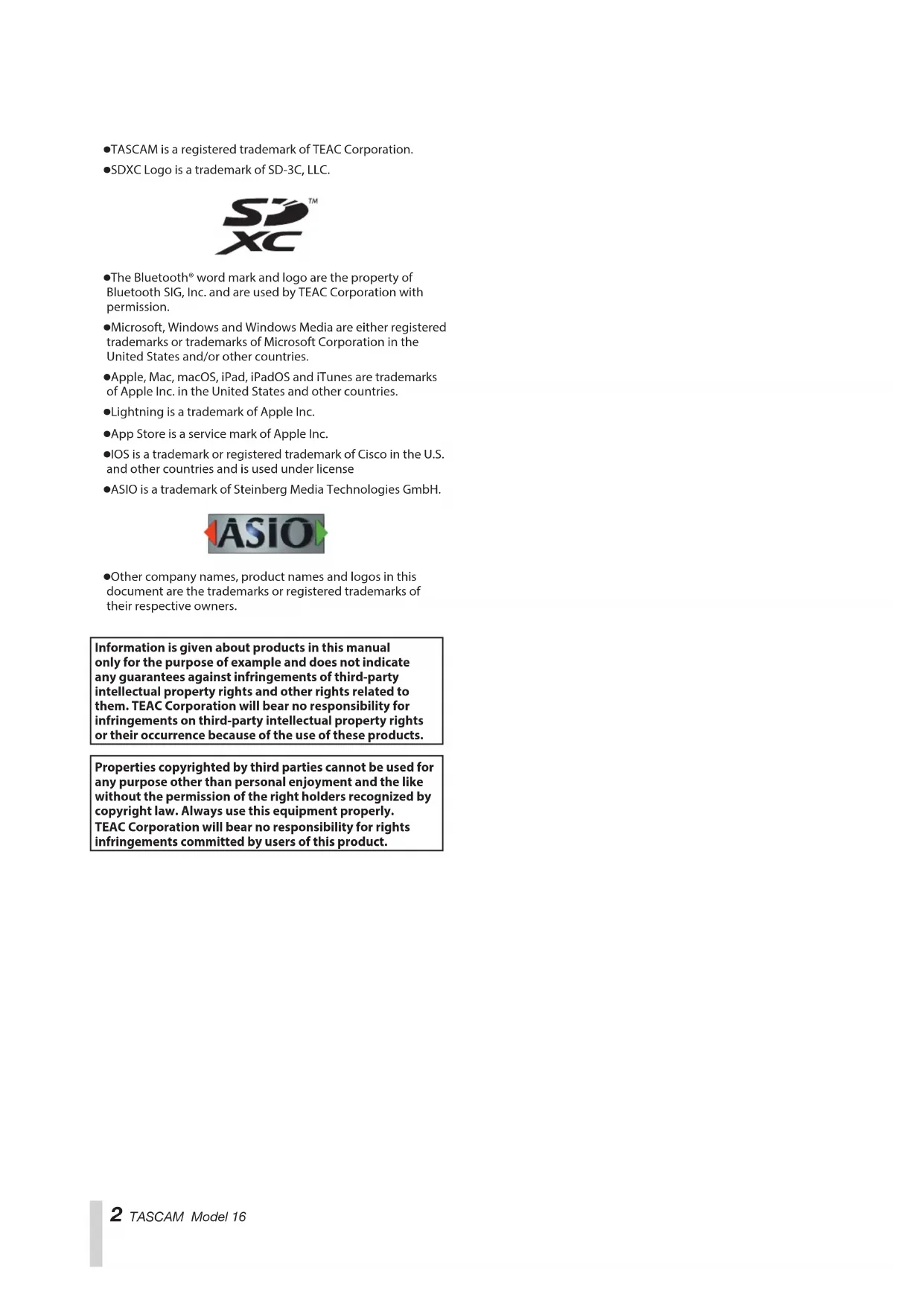 MANUAL DEL USUARIOo TASCAM is a registered trademark of TEAC Corporation. o SDXC Logo is a trademark of SD-3C, LLC. o The Bluetooth® word mark and logo are the property of Bluetooth SIG, Inc. and are used by TEAC Corporation with permission. o Microsoft, Windows and Windows Media are either registered trademarks or trademarks of Microsoft Corporation in the United States and/or other countries. o Apple, Mac, macOS, iPad, iPadOS and iTunes are trademarks of Apple Inc. in the United States and other countries. o Lightning is a trademark of Apple Inc. o App Store is a service mark of Apple Inc. o IOS is a trademark or registered trademark of Cisco in the U.S. and other countries and is used under license o ASIO is a trademark of Steinberg Media Technologies GmbH. o Other company names, product names and logos in this document are the trademarks or registered trademarks of their respective owners. Information is given about products in this manual only for the purpose of example and does not indicate any guarantees against infringements of third-party intellectual property rights and other rights related to them. TEAC Corporation will bear no responsibility for infringements on third-party intellectual property rights or their occurrence because of the use of these products. Properties copyrighted by third parties cannot be used for any purpose other than personal enjoyment and the like without the permission of the right holders recognized by copyright law. Always use this equipment properly. TEAC Corporation will bear no responsibility for rights infringements committed by users of this product. 2 TASCAM Model 16IMPORTANT SAFETY INSTRUCTIONS CAUTION: TO REDUCE THE RISK OF ELECTRIC SHOCK, DO NOT REMOVE COVER (OR BACK). NO USER-SERVICEABLE PARTS INSIDE. REFER SERVICING TO QUALIFIED SERVICE PERSONNEL. The lightning ash with arrowhead symbol, within equilateral triangle, is intended to alert the user to the presence of uninsulated “dangerous voltage” within the product’s enclosure that may be of sucient magnitude to constitute a risk of electric shock to persons. The exclamation point within an equilateral triangle is intended to alert the user to the presence of important operating and maintenance (servicing) instructions in the literature accompanying the appliance.