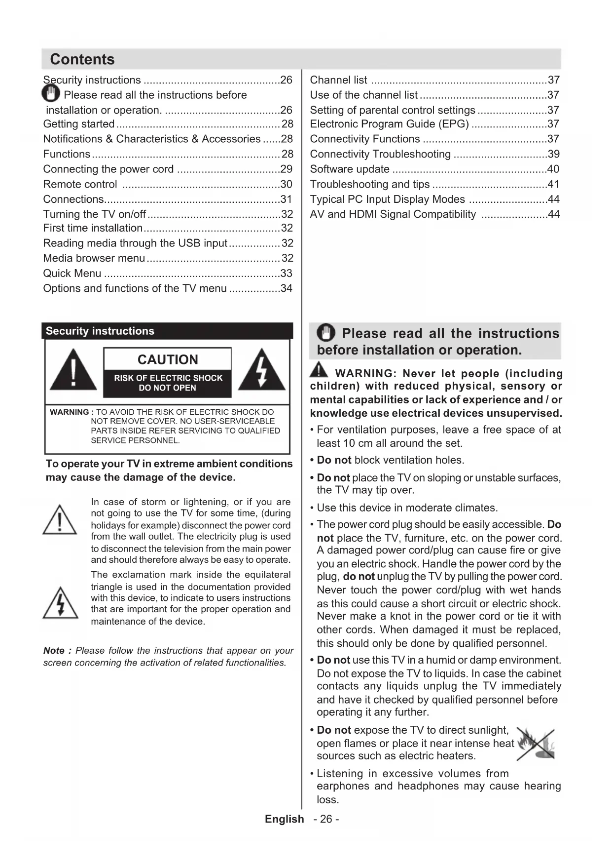 access a menu item, you have to use the code you set during rst installation. If you forget the said code, use the main code 4725. Demo Mode If you want to use your television inside a home, you are advised to select the home mode. If you choose the shop mode, you will have to conrm your choice. Choosing TV receiver mode You will have to choose your reception mode, antenna or cable. If you choose the ANTENNA option from the Type of search screen, the digital television will search for digital terrestrial broadcasts. NOTE: You can press the MENU button to cancel. Once all the available channels have been saved, the list of the channels will appear on the screen. If you nd the said channels interesting, depending on the LCN(*), select Yes, then press OK. Press the MENU button to exit the list of channels and watch the television. (*) LCN Channel number system which displays channels in the order established by government agencies . Installing the cable If you choose the CABLE option and press the OK button on the remote control. You can set the frequencies manually or press OK to start an automatic search. Note: The duration of the search will depend on the search zone selected. Reading media through the USB input You can connect external hard drives (hard drives with or without external power cables, depending on their voltage) or a USB port to your TV through your TV's USB ports. IMPORTANT! Backup your les before making any connection to the TV. Note that the manufacturer shall not be held accountable if les are damaged or data lost. Some types of USB devices (MP3 players for example) or USB ‘‘hard drives / memory cards’’ ‘‘may be incompatible with this television. This television supports FAT32 and NTFS disk formatting. If your hard drive's capacity is above 1TO, you may experience some issues with formatting. Avoid disconnecting your reader quickly after inserting it in the television's USB port. This can physically damage the USB reader and the USB device itself. Never remove the USB while a le is being read. Media browser menu You can view picture, music and video les stored in a USB device by connecting this device to your TV set. Connect a USB stick to one of the USB ports located on the side of the TV set. For video, photo and music les, you can access a settings sub menu (image, sound and others) by pressing the MENU button. By pressing the MENU button again the display disappears. You can set the preferences of your media browser through your settings menu. First time installation - USB connectionsEnglish - 33 - Functioning of the Random / Repeat mode Launch playback with and enable The TV set reads the next le and closes the list. Launch playback with and enable The same folder will be read repeatedly. Launch playback with OK/ and enable The folders concerned will be read randomly. Custom Boot Up Logo You can personalize your TV and see your favorite image or photo on screen each time your TV boots up. To do this, place your favorite image les in a USB stick and open them from the media browser menu. When you have chosen the desired image, highlight it and press OK to view it in full screen. Press OK again to choose the image as custom logo. A conrmation message will be displayed. Select Yes and press OK again. If the image is suitable(*) you will see it on the screen during the TV’s next boot up. Note: If you perform an FTI (rst time installation) the TV will return to using the default logo. (*) Images must have an aspect ratio between 4:3 to 16:9 and they must be in .jpeg, .jpg or .jpe le formats. The image cannot be set as boot logo, which’s resolution doesn’t appear on the info banner. Quick Menu The Quick Settings menu allows you to access some options quickly. This menu includes Power Save Mode, Picture Mode, Favourites, Sleep Timer, FollowMe TV (optional) and Information booklet options. Press Q.MENU button on the remote control to view the quick menu. See the following chapters for details of the listed features. FollowMe TV (optional) With your tablet you can stream the current broadcast from your smart TV using the FollowMe TV feature. Install the appropriate application to your tablet PC. Start the application. For further information on using this feature refer to the instructions of the application you use. FollowMe TV to DMR (optional) This feature allows video streaming from your TV to another TV or mobile devices, using proper applications (e.g. UPnP - Universal Plug and Play - applications like BubbleUPnP). Activate FollowMe TV to DMR and timeshifting starts. Press the red button and device selection menu will be displayed. Choose your device and press OK. Note: This feature works correlated with the PVR feature and requires a connected USB storage device with FAT32 format and enough space in it. HD channels are not supported and both of the devices must be connected to the same network. E-Manual You can nd instructions for your TV’s features in the E-Manual. To use E-Manual, press to the Info button while main menu is displayed on the screen. By using the navigation buttons select a desired category. Every category includes a different topics. Select a topic and press OK to read instructions. To close the E-Manual screen press the Exit button. Note: The contents of the E-Manual may vary according to model. CEC and CEC RC Passthrough This function allows to control the CEC-enabled devices, that are connected through HDMI ports by using the remote control of the TV. The CEC option in the Other Settings menu under Settings menu should be set as Enabled at rst. Press the Source button and select the HDMI input of the connected CEC device from the Source List menu. When new CEC source device is connected, it will be listed in source menu with its own name instead of the connected HDMI ports name(DVD Player, Recorder 1 etc.). The TV remote is automatically able to perform the main functions after the connected HDMI source has been selected. To t