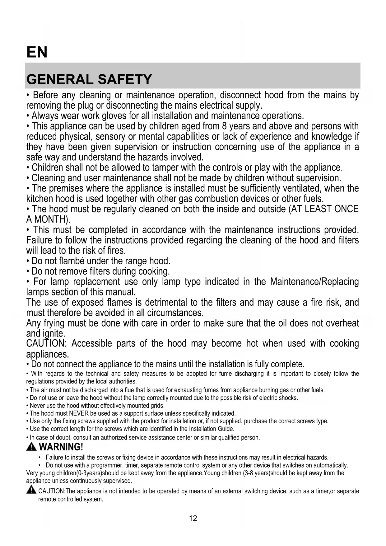 - For lamp replacement use only lamp type indicated in the Maintenance/Replacing lamps section of this manual. The use of exposed flames is detrimental to the filters and may cause a fire risk, and must therefore be avoided in all circumstances. Any frying must be done with care in order to make sure that the oil does not overheat and ignite. CAUTION: Accessible parts of the hood may become hot when used with cooking appliances.
