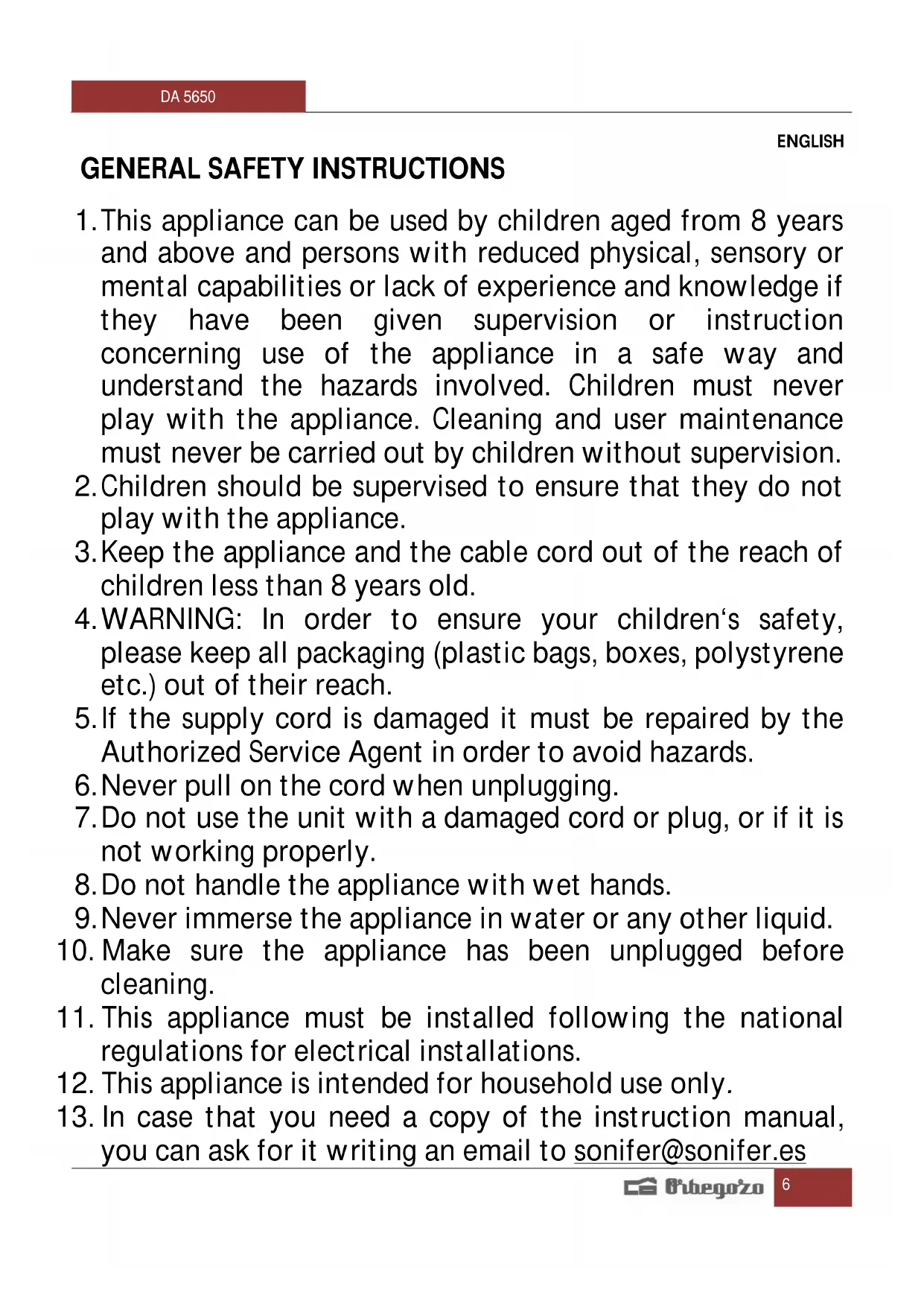Find the device manual for free DA 5650 Orbegozo in PDF.