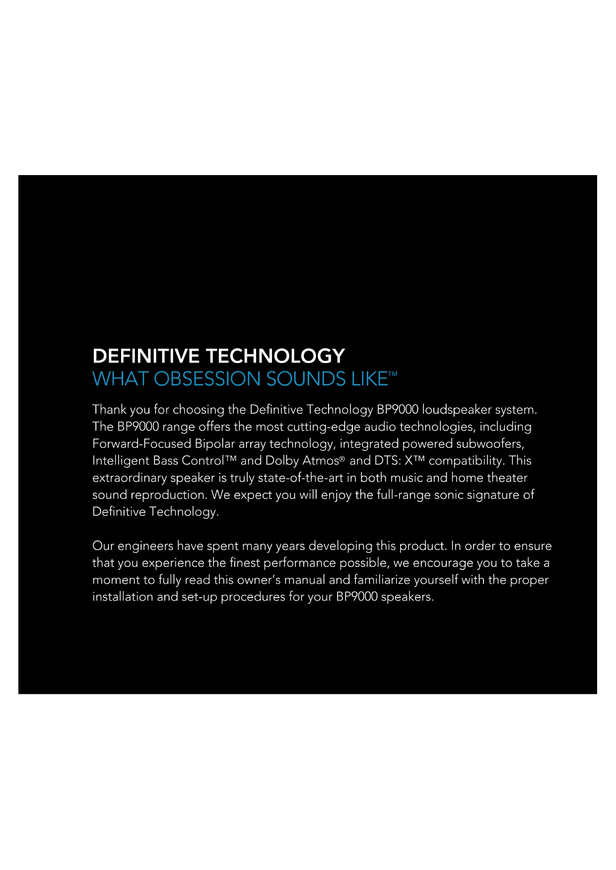 Thank you for choosing the Definitive Technology BP9000 loudspeaker system. The BP9000 range offers the most cutting-edge audio technologies, including Forward-Focused Bipolar array technology, integrated powered subwoofers, Intelligent Bass Control™ and Dolby Atmos