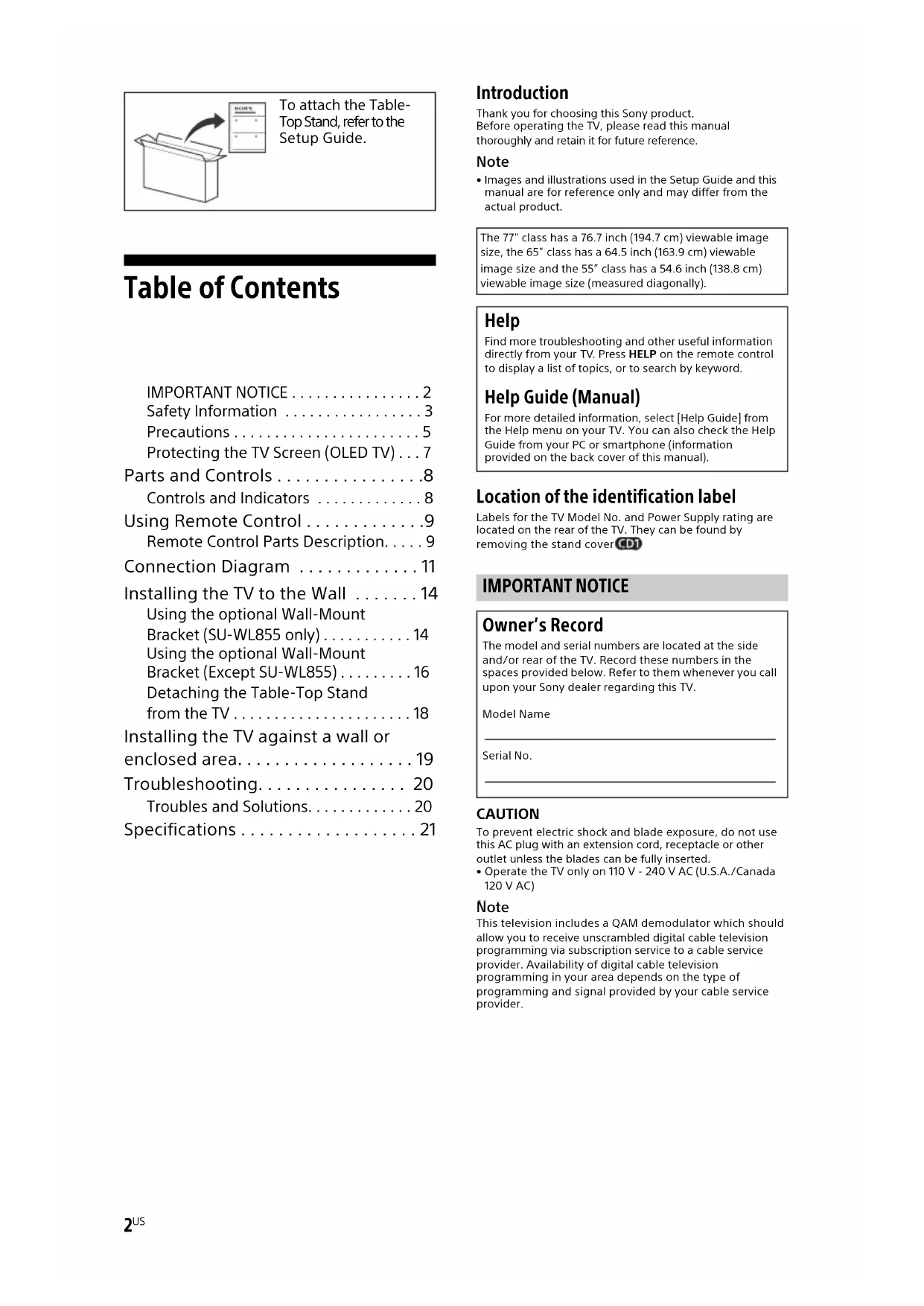 - Images and illustrations used in the Setup Guide and this manual are for reference only and may differ from the actual product. Location of the identification label Labels for the TV Model No. and Power Supply rating are located on the rear of the TV. They can be found by removing the stand cover . CAUTION To prevent electric shock and blade exposure, do not use this AC plug with an extension cord, receptacle or other outlet unless the blades can be fully inserted. • Operate the TV only on 110 V - 240 V AC (U.S.A./Canada 120 V AC) Note Note This television includes a QAM demodulator which should allow you to receive unscrambled digital cable television programming via subscription service to a cable service provider. Availability of digital cable television programming in your area depends on the type of programming and signal provided by your cable service provider. To attach the Table- Top Stand, refer to the