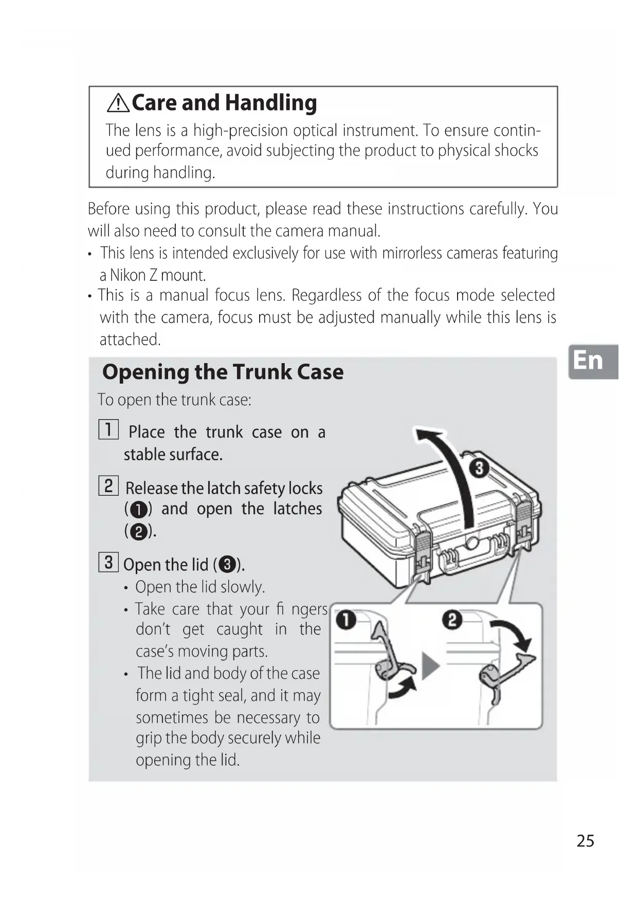 - This is a manual focus lens. Regardless of the focus mode selected with the camera, focus must be adjusted manually while this lens is attached. Opening the Trunk Case Opening the Trunk Case To open the trunk case: z Place the trunk case on a stable surface. x Release the latch safety locks
