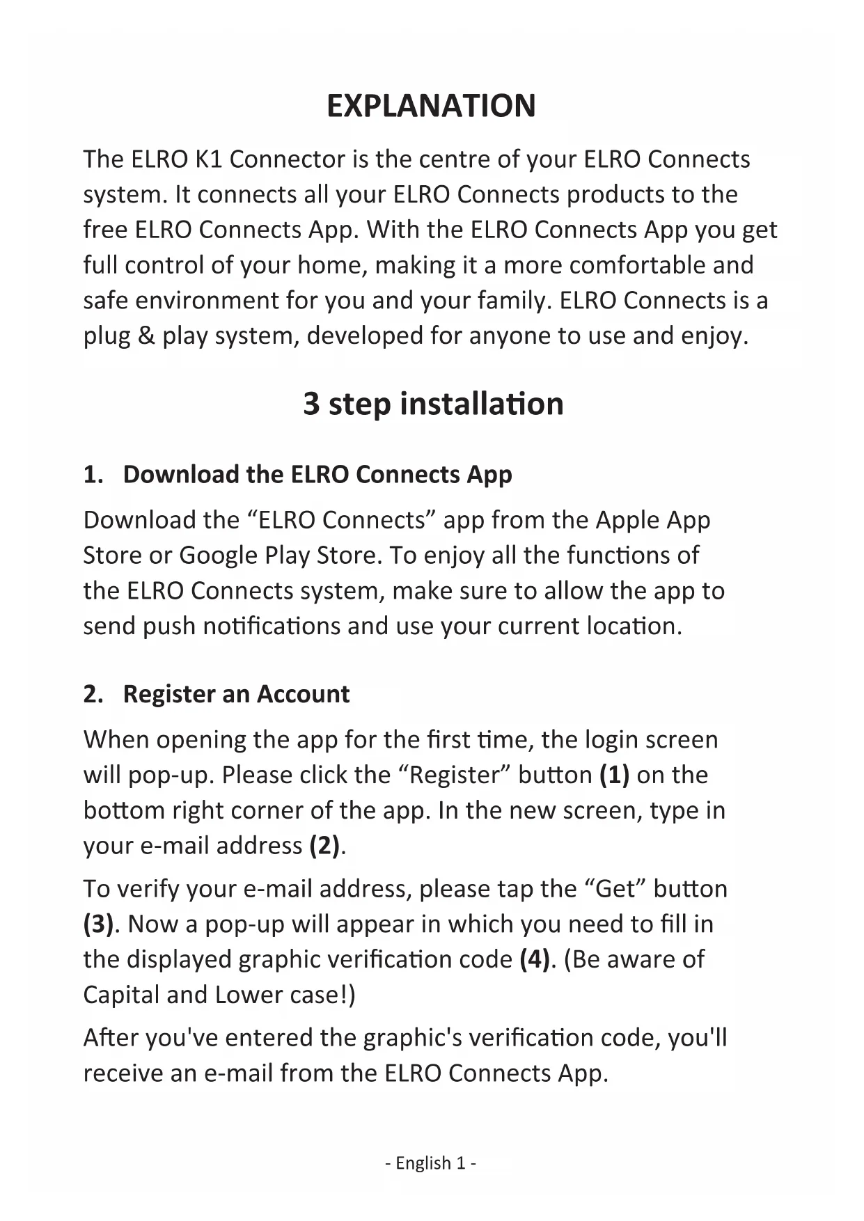 Home is not a place, it’s a feeling SF40GA11 K1 CONNECTOR ELRO CONNECTS CONNECTS English 01 - 07 Deutsch 08 - 14 Nederlands 15 - 21 Français 22 - 28EXPLANATION The ELRO K1 Connector is the centre of your ELRO Connects system. It connects all your ELRO Connects products to the free ELRO Connects App. With the ELRO Connects App you get full control of your home, making it a more comfortable and safe environment for you and your family. ELRO Connects is a plug & play system, developed for anyone to use and enjoy. 3 step installaon