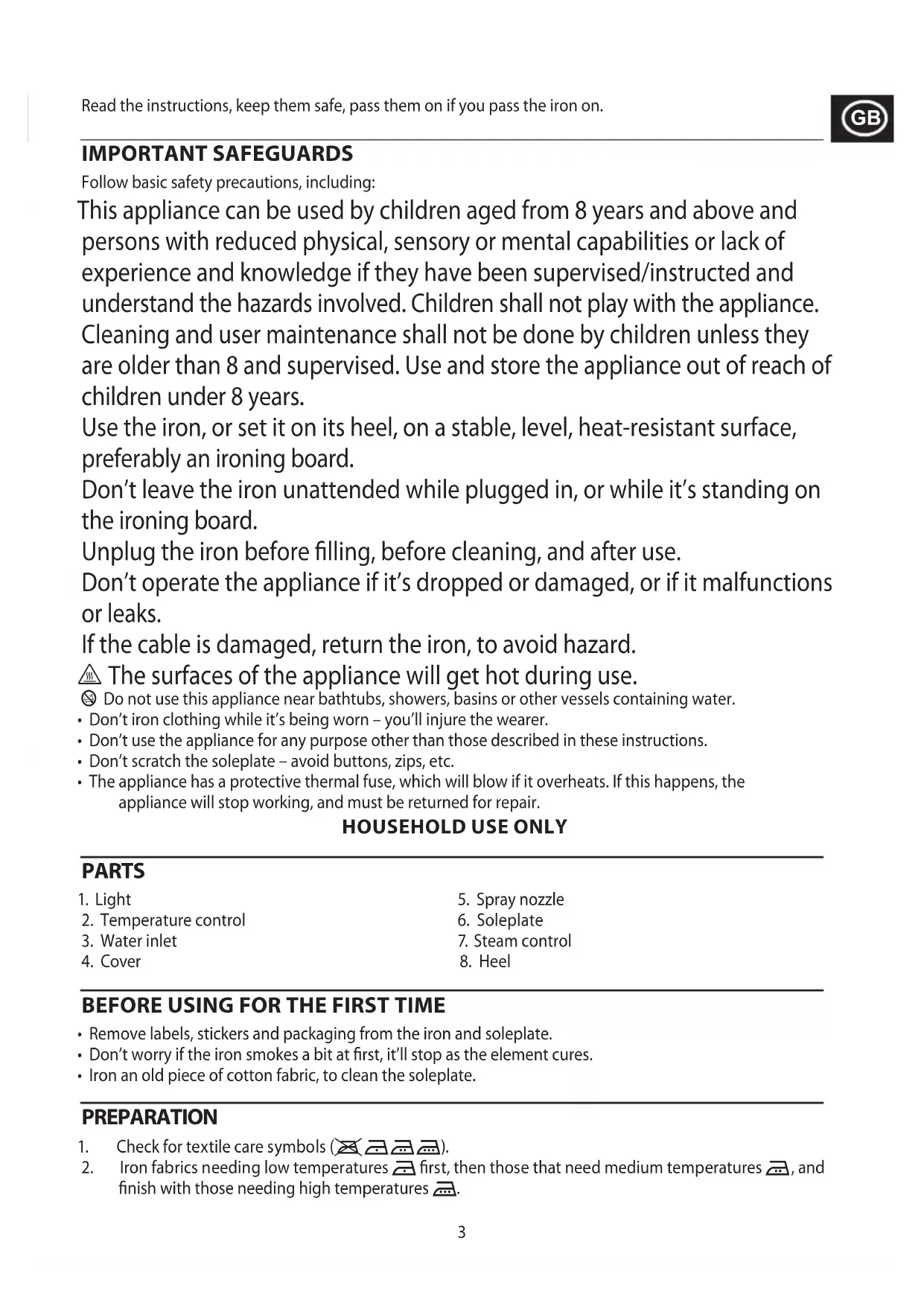 H B3 Read the instructions, keep them safe, pass them on if you pass the iron on. IMPORTANT SAFEGUARDS Follow basic safety precautions, including: This appliance can be used by children aged from 8 years and above and persons with reduced physical, sensory or mental capabilities or lack of experience and knowledge if they have been supervised/instructed and understand the hazards involved. Children shall not play with the appliance. Cleaning and user maintenance shall not be done by children unless they are older than 8 and supervised. Use and store the appliance out of reach of children under 8 years. Use the iron, or set it on its heel, on a stable, level, heat-resistant surface, preferably an ironing board. Don’t leave the iron unattended while plugged in, or while it’s standing on the ironing board. Unplug the iron before lling, before cleaning, and after use. Don’t operate the appliance if it’s dropped or damaged, or if it malfunctions or leaks. If the cable is damaged, return the iron, to avoid hazard.