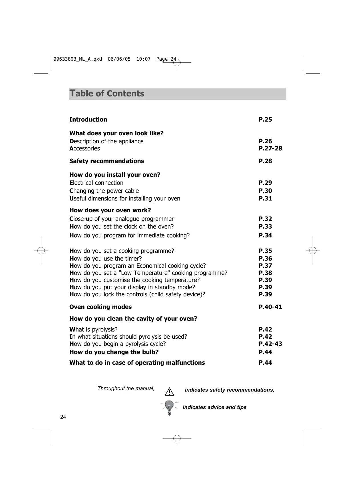 P.13 P.14 P.15 P.16 P.17 P.17 P.17 Table of Contents Introduction P.25 What does your oven look like? Description of the appliance Accessories P.26 P.27-28 Safety recommendations P.28 How do you install your oven? Electrical connection Changing the power cable Useful dimensions for installing your oven P.29 P.30 P.31 How does your oven work? Close-up of your analogue programmer How do you set the clock on the oven? P.32 P.33 How do you program for immediate cooking? P.34 How How How How How How How P.35 P.36 P.37 P.38 P.39 P.39 P.39 you you you you you you you set a cooking programme? use the timer? program an Economical cooking cycle? set a "Low Temperature" cooking programme? customise the cooking temperature? put your display in standby mode? lock the controls (child safety device)? Oven cooking modes P.40-41 How do you clean the cavity of your oven? What is pyrolysis? In what situations should pyrolysis be used? How do you begin a pyrolysis cycle? How do you change the bulb? P.42 P.42 P.42-43 P.44 What to do in case of operating malfunctions P.44 Throughout the manual, indicates safety recommendations, indicates advice and tips