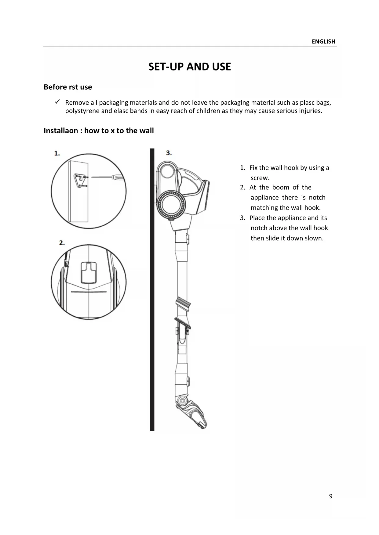 Table of contents Safety advices and warnings 3 Warning 3 Danger of electrocution 5 Conformity 7 Description 8 Set-up and Use 9 Before first use 9 Installation: how to fix to the wall 9 Assembling the appliance with its accessories 10 Using your appliance 12 Cleaning and maintenance 12 Technical information 14 Environment and recycling 14ENGLISH