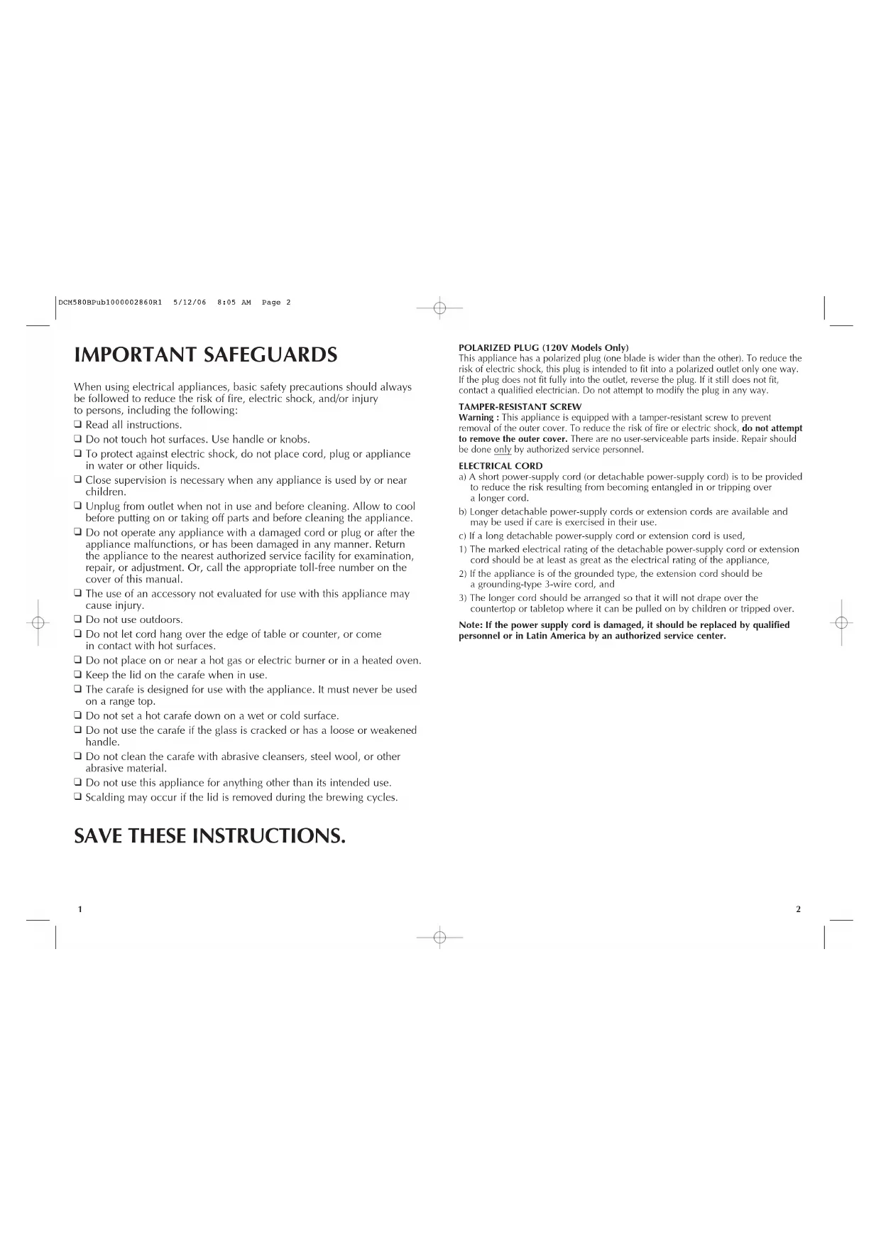 Scalding may occur if the lid is removed during the brewing cycles. SAVE THESE INSTRUCTIONS. POLARIZED PLUG (120V Models Only) This appliance has a polarized plug (one blade is wider than the other). To reduce the risk of electric shock, this plug is intended to fit into a polarized outlet only one way. If the plug does not fit fully into the outlet, reverse the plug. If it still does not fit, contact a qualified electrician. Do not attempt to modify the plug in any way. TAMPER-RESISTANT SCREW