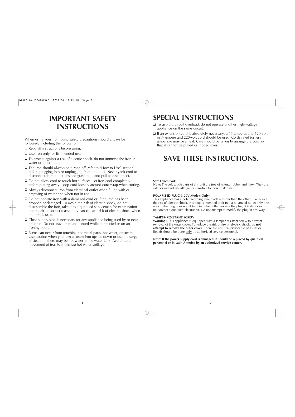 Burns can occur from touching hot metal parts, hot water, or steam. Use caution when you turn a steam iron upside down or use the surge of steam — there may be hot water in the water tank. Avoid rapid movement of iron to minimize hot water spillage. SAVE THESE INSTRUCTIONS. Soft-Touch Parts Note: The soft-touch parts of this unit are free of natural rubber and latex. They are safe for individuals allergic or sensitive to these materials. POLARIZED PLUG (120V Models Only) This appliance has a polarized plug (one blade is wider than the other). To reduce the risk of electric shock, this plug is intended to fit into a polarized outlet only one way. If the plug does not fit fully into the outlet, reverse the plug. If it still does not fit, contact a qualified electrician. Do not attempt to modify the plug in any way. TAMPER-RESISTANT SCREW
