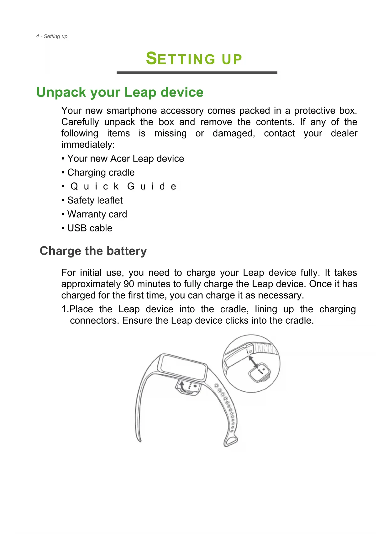 - USB cable Charge the battery For initial use, you need to charge your Leap device fully. It takes approximately 90 minutes to fully charge the Leap device. Once it has charged for the first time, you can charge it as necessary. 1.Place the Leap device into the cradle, lining up the charging connectors. Ensure the Leap device clicks into the cradle.Setting up - 5 2.Connect the cradle to your computer using the supplied USB cable. 3.Charge your Leap device for about 90 minutes to charge fully. You can keep track of the charge progress on the screen. Securing the wristband 1.Put on the wristband as illustrated. 2.Feed one end of the strap through the loop at the other end of the strap. Align both ends of the wristband so they are directly Note Double-tap the screen to see the charge level.6 - Setting up overlapping each other with the clasp over the two holes that best fit your wrist. 3.Squeeze both the clasp and the wristband between your thumb and forefinger until the wristband is properly secured. You’ll know your Leap wristband is securely fastened if both tabs on the clasp are fully inserted into the wristband.Setting up - 7 Changing the strap You can change the strap if desired. Carefully push the Liquid Leap Active body out of the strap and insert it into the new strap, making sure it is properly inserted. Care and wearing tips Keep the following tips in mind when caring for your Leap device: