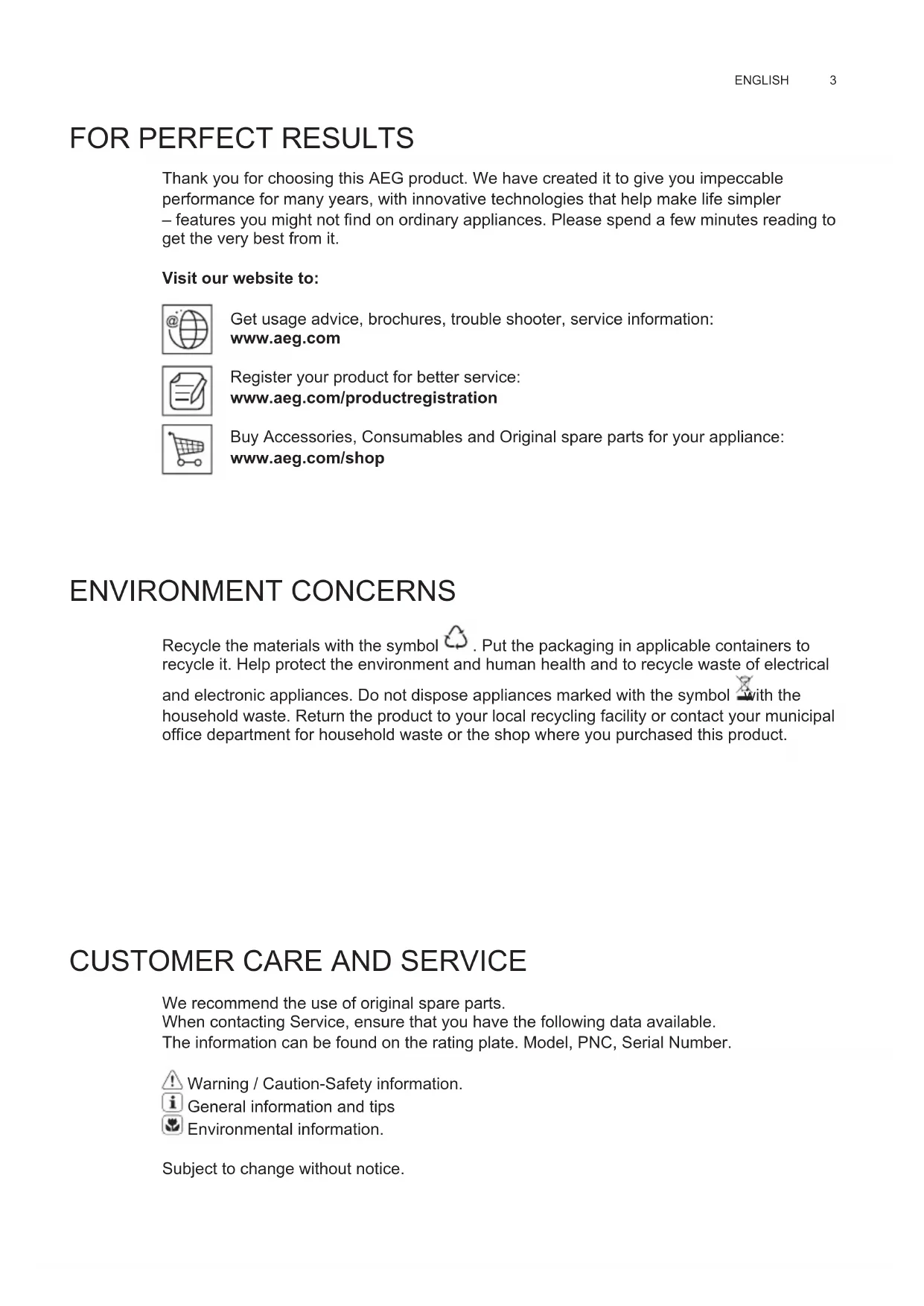 We recommend the use of original spare parts. When contacting Service, ensure that you have the following data available. The information can be found on the rating plate. Model, PNC, Serial Number. Warning / Caution-Safety information. General information and tips Environmental information. Subject to change without notice.