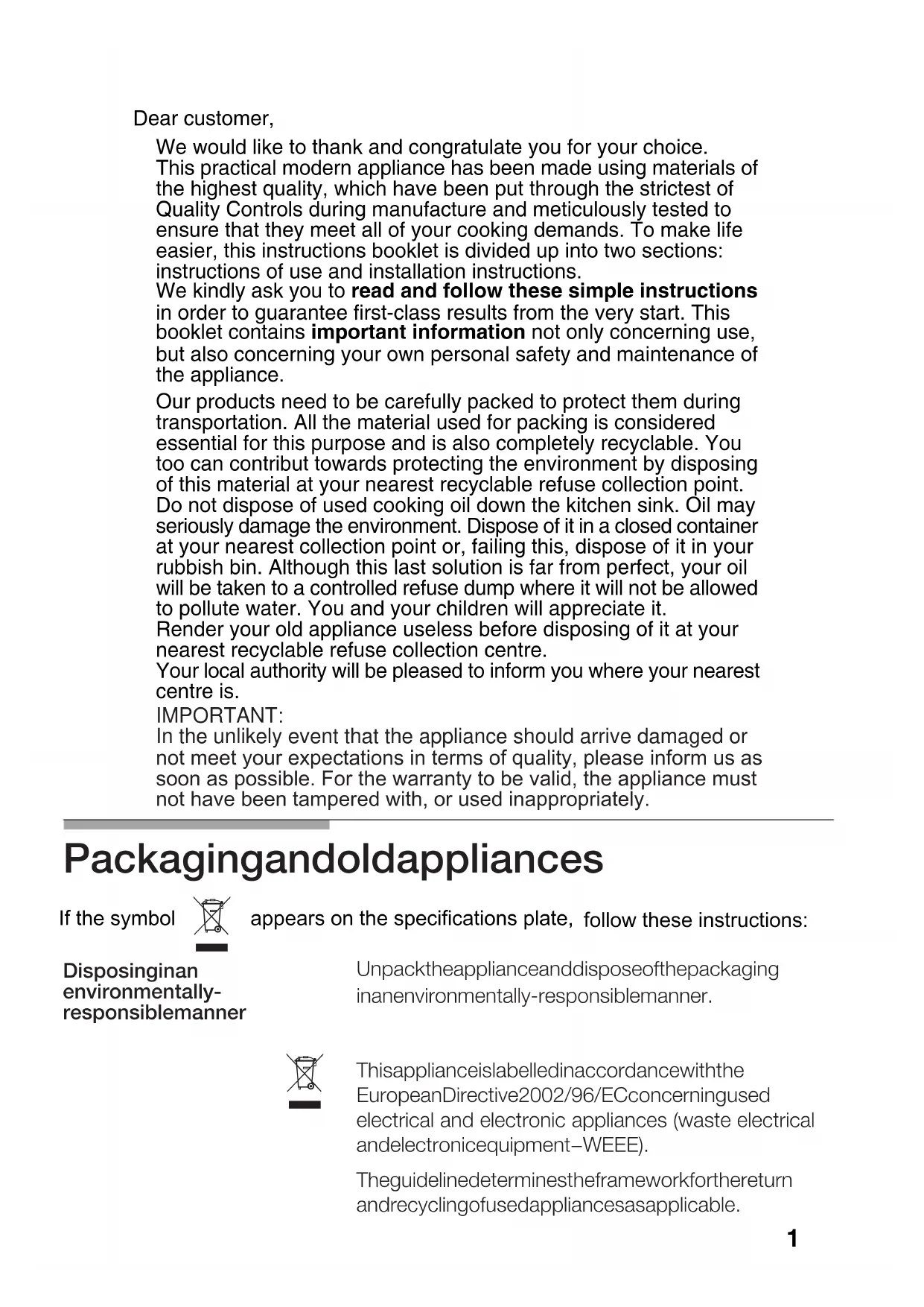 tr Kullanma KIlavuzuDear customer, We would like to thank and congratulate you for your choice. This practical modern appliance has been made using materials of the highest quality, which have been put through the strictest of Quality Controls during manufacture and meticulously tested to ensure that they meet all of your cooking demands. To make life easier, this instructions booklet is divided up into two sections: instructions of use and installation instructions. We kindly ask you to read and follow these simple instructions in order to guarantee first-class results from the very start. This booklet contains important information not only concerning use, but also concerning your own personal safety and maintenance of the appliance. Our products need to be carefully packed to protect them during transportation. All the material used for packing is considered essential for this purpose and is also completely recyclable. You too can contribut towards protecting the environment by disposing of this material at your nearest recyclable refuse collection point. Do not dispose of used cooking oil down the kitchen sink. Oil may seriously damage the environment. Dispose of it in a closed container at your nearest collection point or, failing this, dispose of it in your rubbish bin. Although this last solution is far from perfect, your oil will be taken to a controlled refuse dump where it will not be allowed to pollute water. You and your children will appreciate it. Render your old appliance useless before disposing of it at your nearest recyclable refuse collection centre. Your local authority will be pleased to inform you where your nearest centre is.