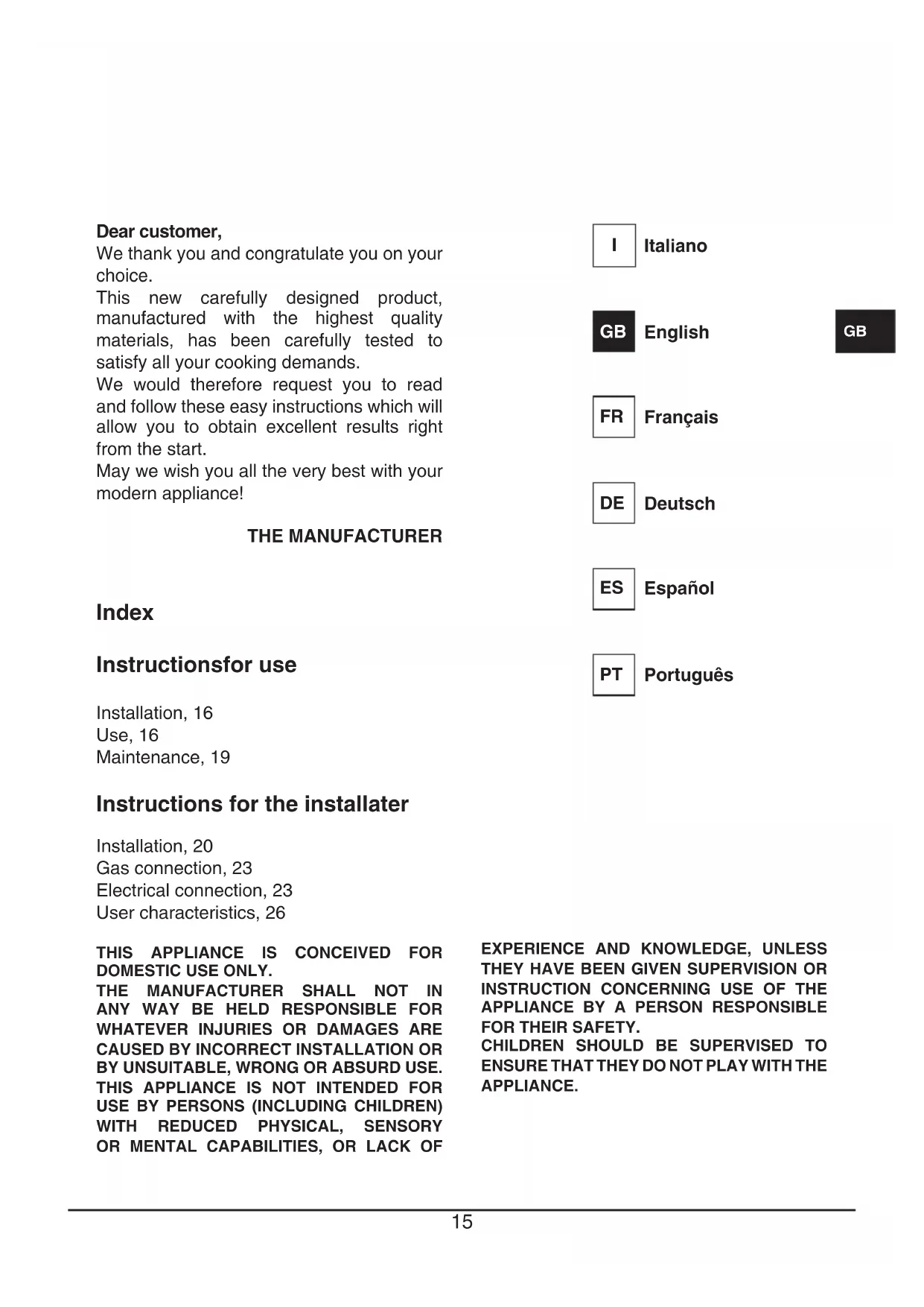 THE MANUFACTURER SHALL NOT IN ANY WAY BE HELD RESPONSIBLE FOR WHATEVER INJURIES OR DAMAGES ARE CAUSED BY INCORRECT INSTALLATION OR BY UNSUITABLE, WRONG OR ABSURD USE. THIS APPLIANCE IS NOT INTENDED FOR USE BY PERSONS (INCLUDING CHILDREN) WITH REDUCED PHYSICAL, SENSORY OR MENTAL CAPABILITIES, OR LACK OF