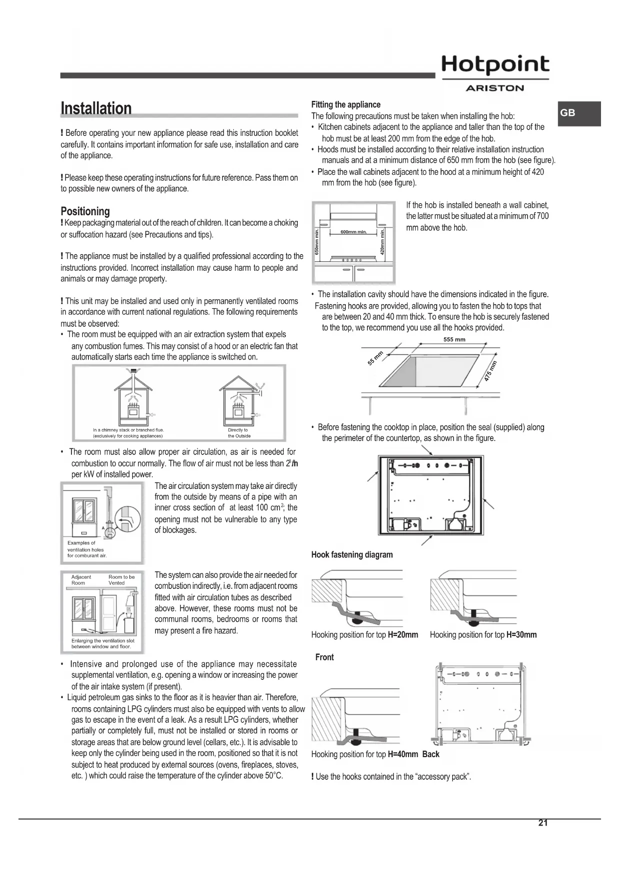 - The installation cavity should have the dimensions indicated in the gure. Fastening hooks are provided, allowing you to fasten the hob to tops that are between 20 and 40 mm thick. To ensure the hob is securely fastened to the top, we recommend you use all the hooks provided. 555 mm 55 mm 475 mm