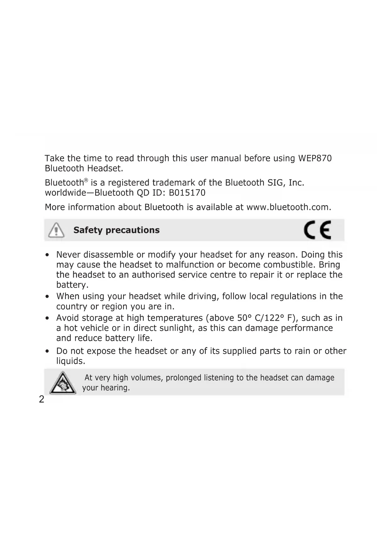 is a registered trademark of the Bluetooth SIG, Inc. worldwide—Bluetooth QD ID: B015170 More information about Bluetooth is available at www.bluetooth.com. Safety precautions Never disassemble or modify your headset for any reason. Doing this may cause the headset to malfunction or become combustible. Bring the headset to an authorised service centre to repair it or replace the battery. When using your headset while driving, follow local regulations in the country or region you are in. Avoid storage at high temperatures (above 50° C/122° F), such as in a hot vehicle or in direct sunlight, as this can damage performance and reduce battery life. Do not expose the headset or any of its supplied parts to rain or other liquids. At very high volumes, prolonged listening to the headset can damage your hearing.