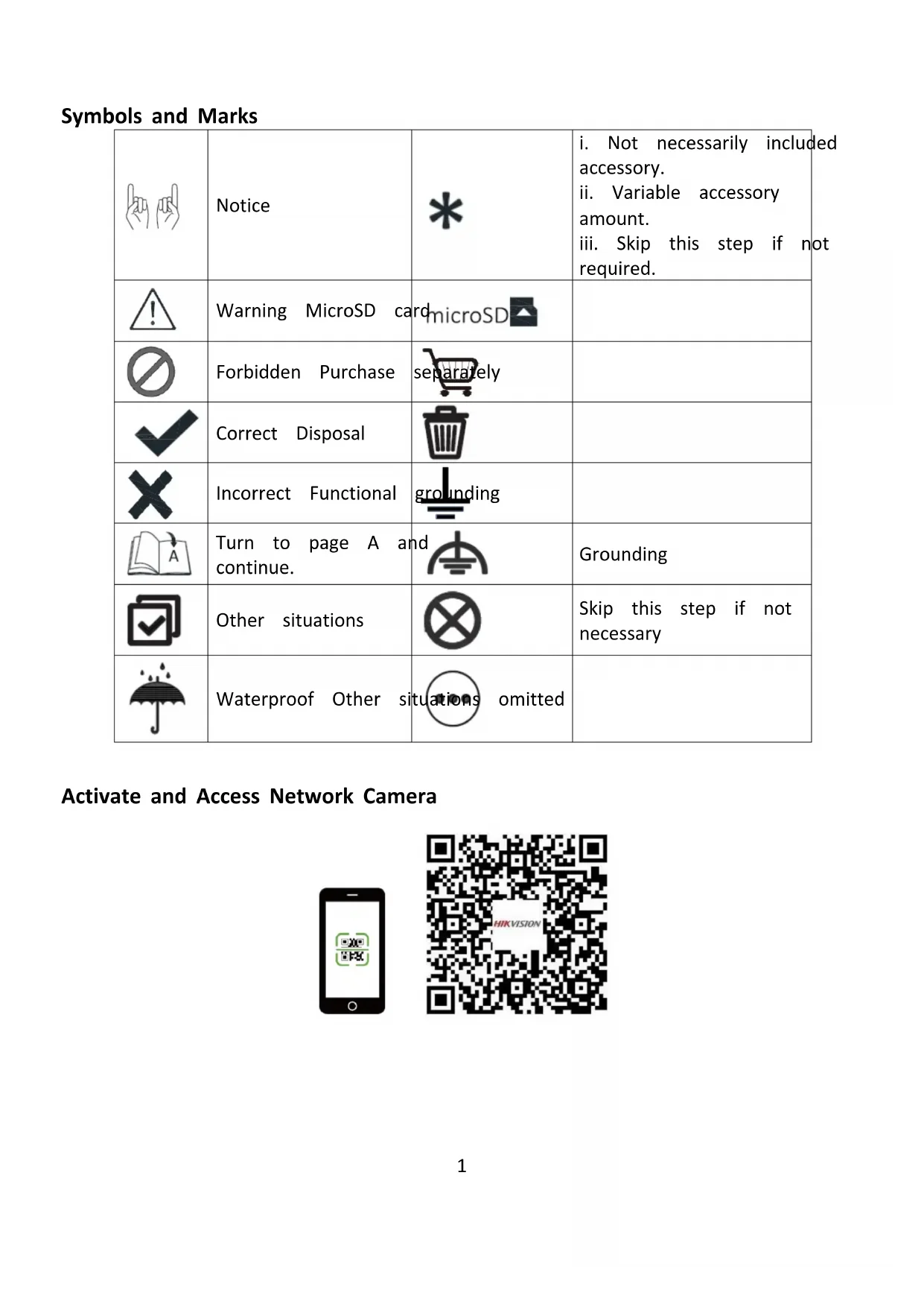 required. Warning MicroSD card Forbidden Purchase separately Correct Disposal Incorrect Functional grounding Turn to page A and continue. Grounding Other situations Skip this step if not necessary Waterproof Other situations omitted Activate and Access Network Camera2 English Interface Introduction 1 Power input interface 2 Power output interface 3 Network interface 4 Alarm input interface 5 Alarm output interface 6 Audio input interface 7 Audio output interface 8 Built-in microphone 9 Built-in speaker 10 BNC/CVBS interface 11 HDMI interface 12 SDI interface 13 SD card slot 14 SIM card slot 15 Reset button 16 Fiber optical interface 17 Heater 18 USB 19 Antenna 20 RS-485 21 RS-232 22 ABF 23 Grounding 24 Wiegand interface Note: The interface varies with the models. Please refer to the product datasheet for details. ©2021 Hangzhou Hikvision Digital Technology Co., Ltd. All rights reserved. This Manual is the property of Hangzhou Hikvision Digital Technology Co., Ltd. or its affiliates (hereinafter referred to as "Hikvision"), and it cannot be reproduced, changed, translated, or distributed, partially or wholly, by any means, without the prior written permission of Hikvision. Unless otherwise expressly stated herein, Hikvision does not make any warranties, guarantees or representations, express or implied, regarding to the Manual, any information contained herein. About this Manual The Manual includes instructions for using and managing the product. Pictures, charts, images and all other information hereinafter are for description and explanation only. The information contained in the Manual is subject to change, without notice, due to firmware updates or other reasons. Please find the latest version in the company website (https://www.hikvision.com). Please use this user manual under the guidance of professionals. Trademarks Acknowledgement and other Hikvision’s trademarks and logos are the properties of Hikvision in various jurisdictions. Other trademarks and logos mentioned below are the properties of their respective owners. Other trademarks and logos mentioned are the properties of their respective owners. Legal Disclaimer TO THE MAXIMUM EXTENT PERMITTED BY APPLICABLE LAW, THIS MANUAL AND THE PRODUCT DESCRIBED, WITH ITS HARDWARE, SOFTWARE AND FIRMWARE, ARE PROVIDED “AS IS” AND “WITH ALL FAULTS AND ERRORS”. HIKVISION MAKES NO WARRANTIES,