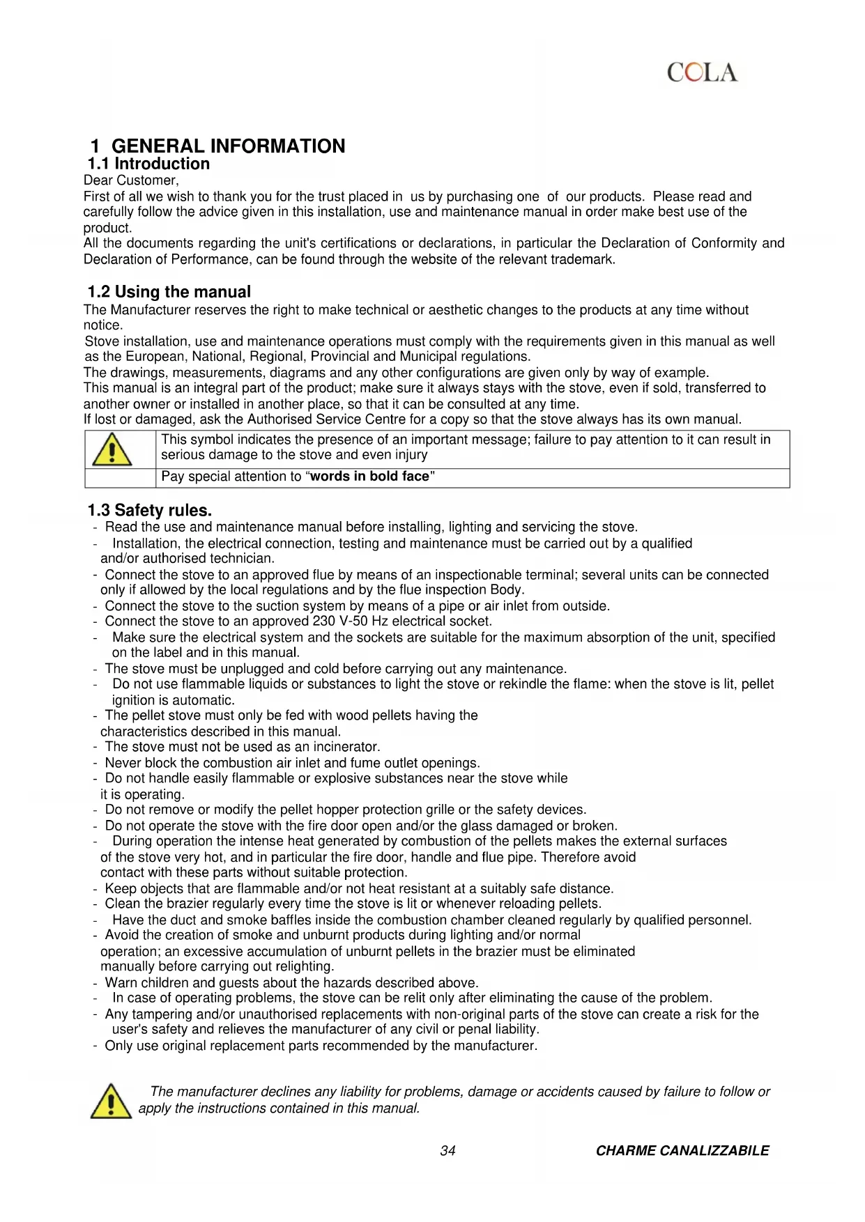 COLA guarantees its products, except for parts subject to normal wear, in accordance with the current regulations. For the warranty terms, please contact the importer or the authorised agent who can integrate the compulsory warranty period with an additional period under his sole and exclusive responsibility.