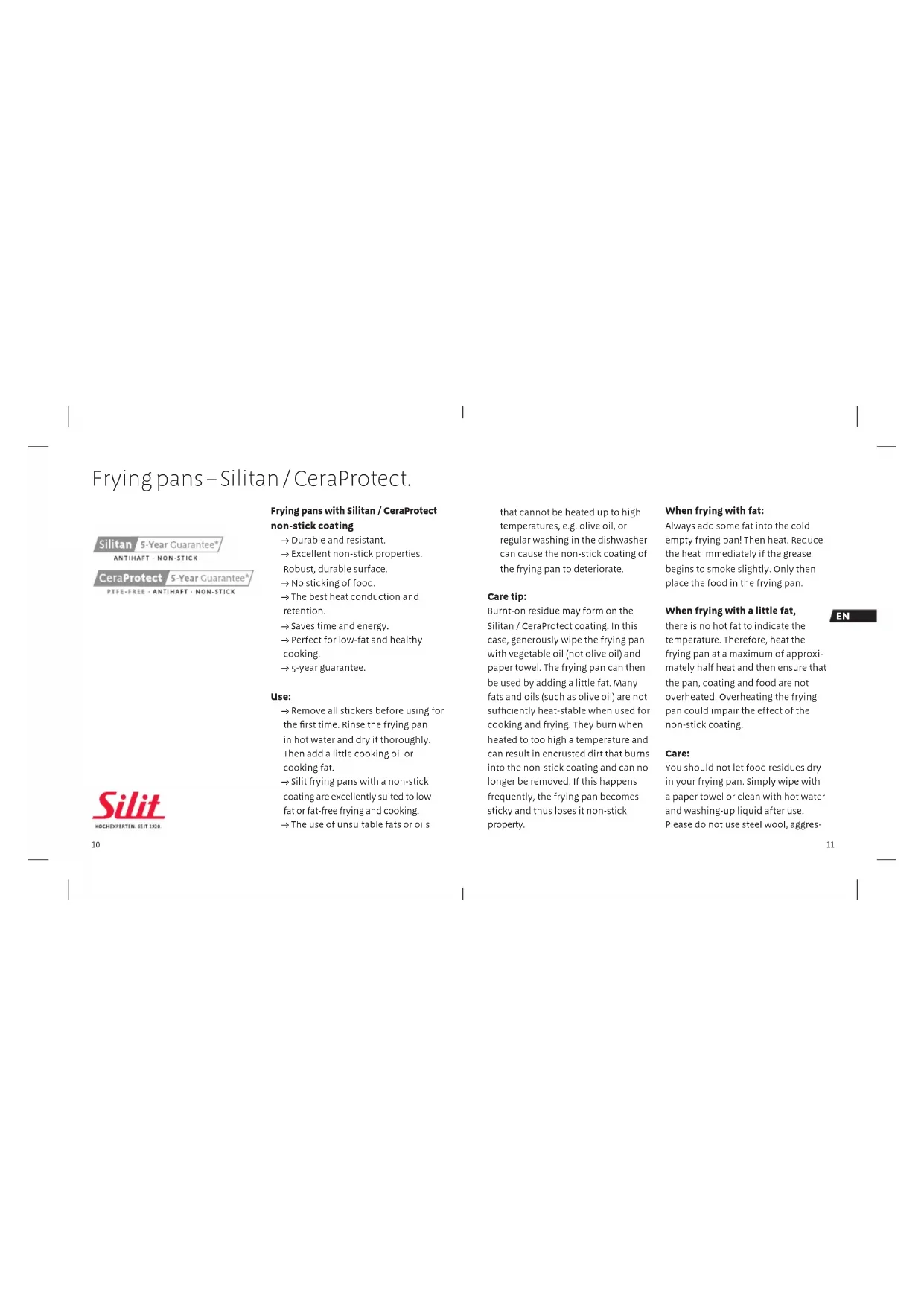 - The use of unsuitable fats or oils that cannot be heated up to high temperatures, e.g. olive oil, or regular washing in the dishwasher can cause the non-stick coating of the frying pan to deteriorate. Care tip: Burnt-on residue may form on the Silitan / CeraProtect coating. In this case, generously wipe the frying pan with vegetable oil (not olive oil) and paper towel. The frying pan can then be used by adding a little fat. Many fats and oils (such as olive oil) are not sufficiently heat-stable when used for cooking and frying. They burn when heated to too high a temperature and can result in encrusted dirt that burns into the non-stick coating and can no longer be removed. If this happens frequently, the frying pan becomes sticky and thus loses it non-stick property. When frying with fat: Always add some fat into the cold empty frying pan! Then heat. Reduce the heat immediately if the grease begins to smoke slightly. Only then place the food in the frying pan. When frying with a little fat, there is no hot fat to indicate the temperature. Therefore, heat the frying pan at a maximum of approxi- mately half heat and then ensure that the pan, coating and food are not overheated. Overheating the frying pan could impair the effect of the non-stick coating. Care: You should not let food residues dry in your frying pan. Simply wipe with a paper towel or clean with hot water and washing-up liquid after use. Please do not use steel wool, aggres- Frying pans – Silitan / CeraProtect.EN