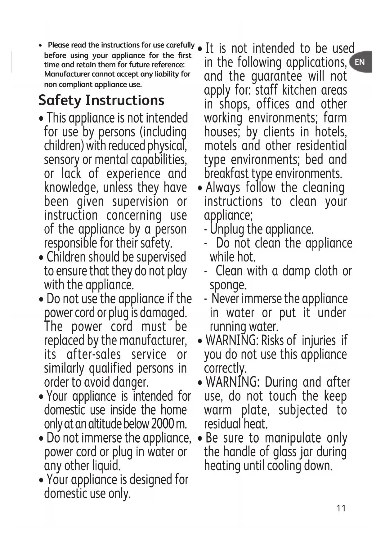 - Please read the instructions for use carefully before using your appliance for the first time and retain them for future reference: Manufacturer cannot accept any liability for non compliant appliance use. Safety Instructions