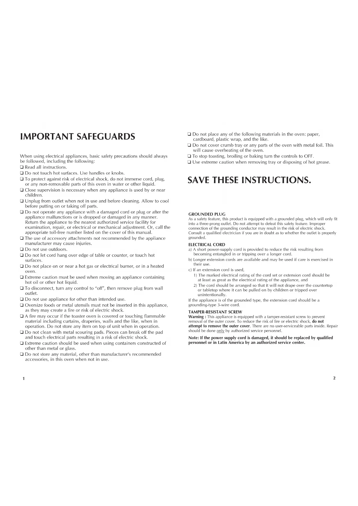 When using electrical appliances, basic safety precautions should always be followed, including the following: ❑ Read all instructions. ❑ Do not touch hot surfaces. Use handles or knobs. ❑ To protect against risk of electrical shock, do not immerse cord, plug, or any non-removable parts of this oven in water or other liquid. ❑ Close supervision is necessary when any appliance is used by or near children. ❑ Unplug from outlet when not in use and before cleaning. Allow to cool before putting on or taking off parts. ❑ Do not operate any appliance with a damaged cord or plug or after the appliance malfunctions or is dropped or damaged in any manner. Return the appliance to the nearest authorized service facility for examination, repair, or electrical or mechanical adjustment. Or, call the appropriate toll-free number listed on the cover of this manual. ❑ The use of accessory attachments not recommended by the appliance manufacturer may cause injuries. ❑ Do not use outdoors. ❑ Do not let cord hang over edge of table or counter, or touch hot surfaces. ❑ Do not place on or near a hot gas or electrical burner, or in a heated oven. ❑ Extreme caution must be used when moving an appliance containing hot oil or other hot liquid. ❑ To disconnect, turn any control to “off”, then remove plug from wall outlet. ❑ Do not use appliance for other than intended use. ❑ Oversize foods or metal utensils must not be inserted in this appliance, as they may create a fire or risk of electric shock. ❑ A fire may occur if the toaster oven is covered or touching flammable material including curtains, draperies, walls and the like, when in operation. Do not store any item on top of unit when in operation. ❑ Do not clean with metal scouring pads. Pieces can break off the pad and touch electrical parts resulting in a risk of electric shock. ❑ Extreme caution should be used when using containers constructed of other than metal or glass. ❑ Do not store any material, other than manufacturer's recommended accessories, in this oven when not in use. IMPORTANT SAFEGUARDS SAVE THESE INSTRUCTIONS. GROUNDED PLUG As a safety feature, this product is equipped with a grounded plug, which will only fit into a three-prong outlet. Do not attempt to defeat this safety feature. Improper connection of the grounding conductor may result in the risk of electric shock. Consult a qualified electrician if you are in doubt as to whether the outlet is properly grounded. ELECTRICAL CORD a) A short power-supply cord is provided to reduce the risk resulting from becoming entangled in or tripping over a longer cord. b) Longer extension cords are available and may be used if care is exercised in their use. c) If an extension cord is used,