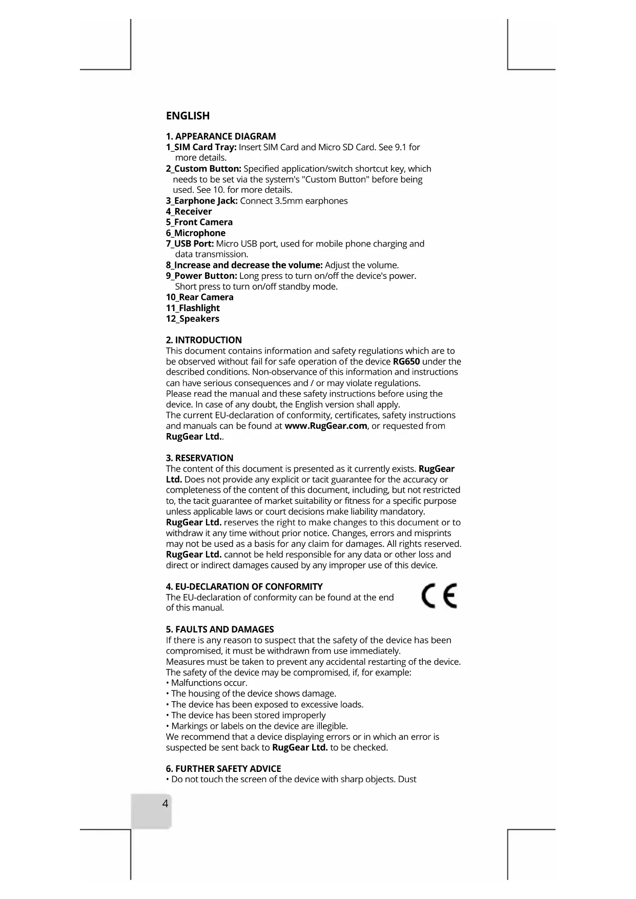 This document contains information and safety regulations which are to be observed without fail for safe operation of the device RG650 under the described conditions. Non-observance of this information and instructions can have serious consequences and / or may violate regulations. Please read the manual and these safety instructions before using the device. In case of any doubt, the English version shall apply. The current EU-declaration of conformity, certificates, safety instructions and manuals can be found at www.RugGear.com, or requested from RugGear Ltd..