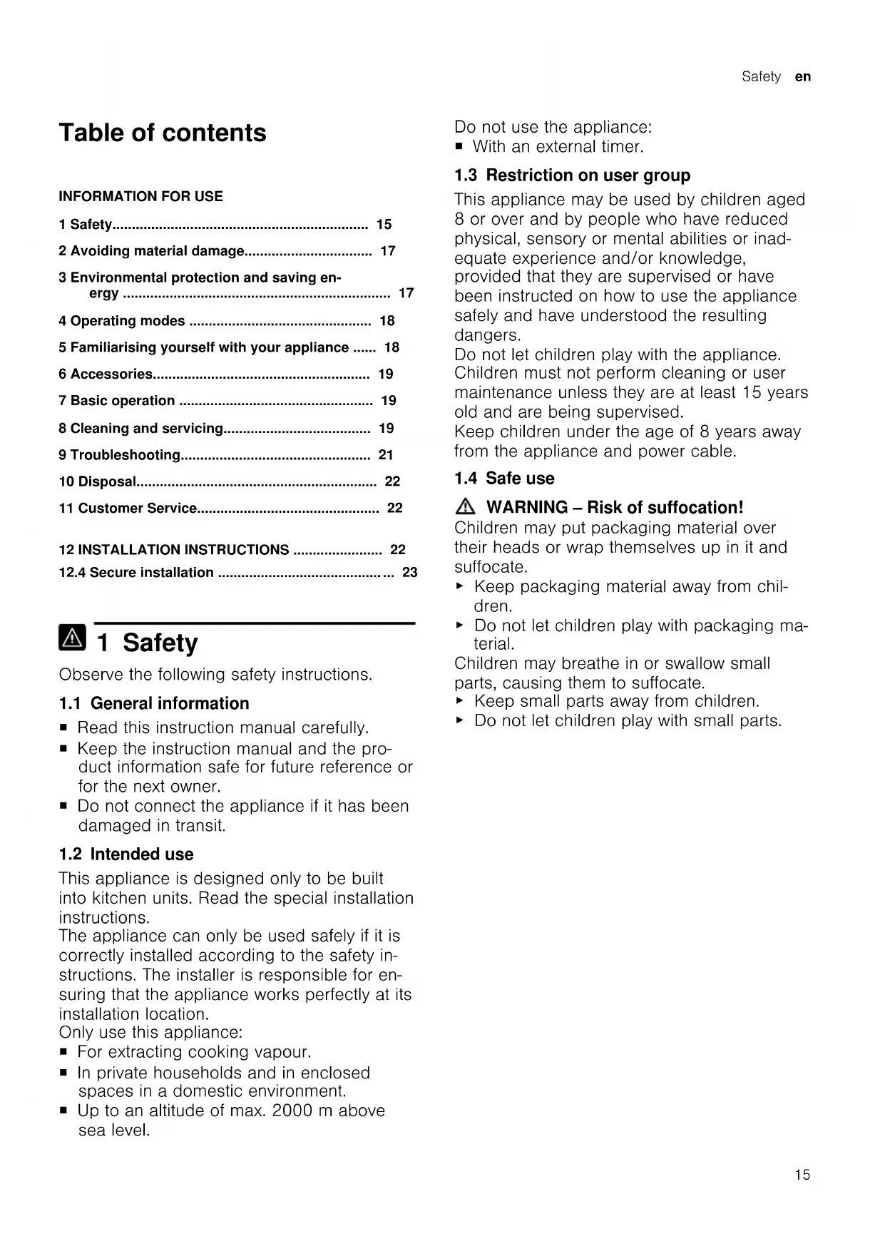 1 Safety Observe the following safety instructions. 1.1 General information ¡ Read this instruction manual carefully. ¡ Keep the instruction manual and the pro- duct information safe for future reference or for the next owner. ¡ Do not connect the appliance if it has been damaged in transit. 1.2 Intended use This appliance is designed only to be built into kitchen units. Read the special installation instructions. The appliance can only be used safely if it is correctly installed according to the safety in- structions. The installer is responsible for en- suring that the appliance works perfectly at its installation location. Only use this appliance: ¡ For extracting cooking vapour. ¡ In private households and in enclosed spaces in a domestic environment. ¡ Up to an altitude of max. 2000m above sea level. Do not use the appliance: ¡ With an external timer. 1.3 Restriction on user group This appliance may be used by children aged 8 or over and by people who have reduced physical, sensory or mental abilities or inad- equate experience and/or knowledge, provided that they are supervised or have been instructed on how to use the appliance safely and have understood the resulting dangers. Do not let children play with the appliance. Children must not perform cleaning or user maintenance unless they are at least 15 years old and are being supervised. Keep children under the age of 8 years away from the appliance and power cable. 1.4 Safe use WARNING‒Risk of suffocation! Children may put packaging material over their heads or wrap themselves up in it and suffocate. ▶ Keep packaging material away from chil- dren. ▶ Do not let children play with packaging ma- terial. Children may breathe in or swallow small parts, causing them to suffocate. ▶ Keep small parts away from children. ▶ Do not let children play with small parts.en Safety