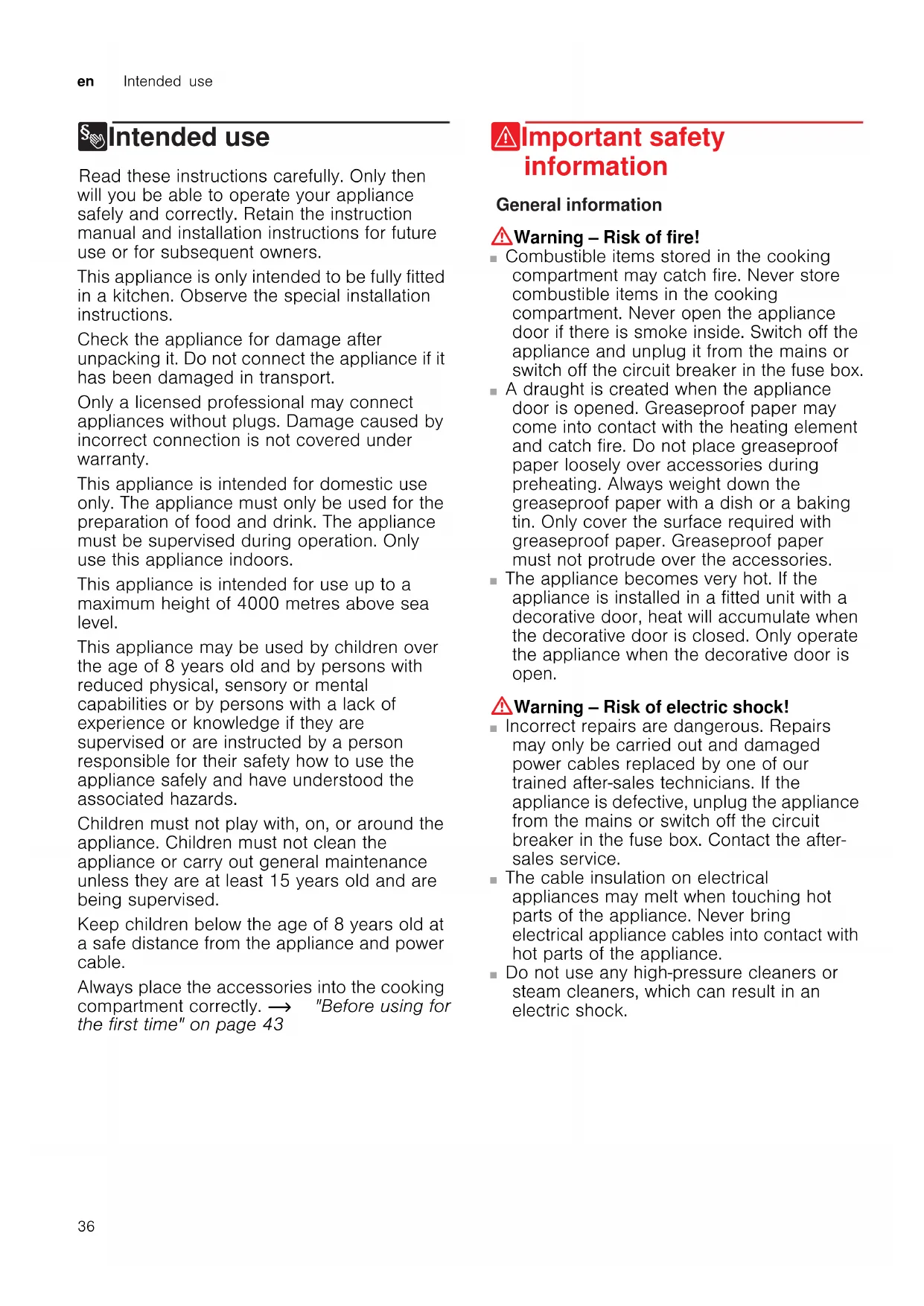8Intended use Intended use Read these instructions carefully. Only then will you be able to operate your appliance safely and correctly. Retain the instruction manual and installation instructions for future use or for subsequent owners. This appliance is only intended to be fully fitted in a kitchen. Observe the special installation instructions. Check the appliance for damage after unpacking it. Do not connect the appliance if it has been damaged in transport. Only a licensed professional may connect appliances without plugs. Damage caused by incorrect connection is not covered under warranty. This appliance is intended for domestic use only. The appliance must only be used for the preparation of food and drink. The appliance must be supervised during operation. Only use this appliance indoors. This appliance is intended for use up to a maximum height of 4000 metres above sea level. This appliance may be used by children over the age of 8 years old and by persons with reduced physical, sensory or mental capabilities or by persons with a lack of experience or knowledge if they are supervised or are instructed by a person responsible for their safety how to use the appliance safely and have understood the associated hazards. Children must not play with, on, or around the appliance. Children must not clean the appliance or carry out general maintenance unless they are at least 15 years old and are being supervised. Keep children below the age of 8 years old at a safe distance from the appliance and power cable. Always place the accessories into the cooking compartment correctly. ~ "Before using for the first time" on page 43 (Important safety information Impor t ant saf et y informat i on General information :Warning – Risk of fire! ■ Combustible items stored in the cooking compartment may catch fire. Never store combustible items in the cooking compartment. Never open the appliance door if there is smoke inside. Switch off the appliance and unplug it from the mains or switch off the circuit breaker in the fuse box. Risk of fire! ■ A draught is created when the appliance door is opened. Greaseproof paper may come into contact with the heating element and catch fire. Do not place greaseproof paper loosely over accessories during preheating. Always weight down the greaseproof paper with a dish or a baking tin. Only cover the surface required with greaseproof paper. Greaseproof paper must not protrude over the accessories. Risk of fire! ■ The appliance becomes very hot. If the appliance is installed in a fitted unit with a decorative door, heat will accumulate when the decorative door is closed. Only operate the appliance when the decorative door is open. :Warning – Risk of electric shock! ■ Incorrect repairs are dangerous. Repairs may only be carried out and damaged power cables replaced by one of our trained after-sales technicians. If the appliance is defective, unplug the appliance from the mains or switch off the circuit breaker in the fuse box. Contact the after- sales service. Risk of electric shock and serious injury! ■ The cable insulation on electrical appliances may melt when touching hot parts of the appliance. Never bring electrical appliance cables into contact with hot parts of the appliance. Risk of electric shock! ■ Do not use any high-pressure cleaners or steam cleaners, which can result in an electric shock.Important safety information en