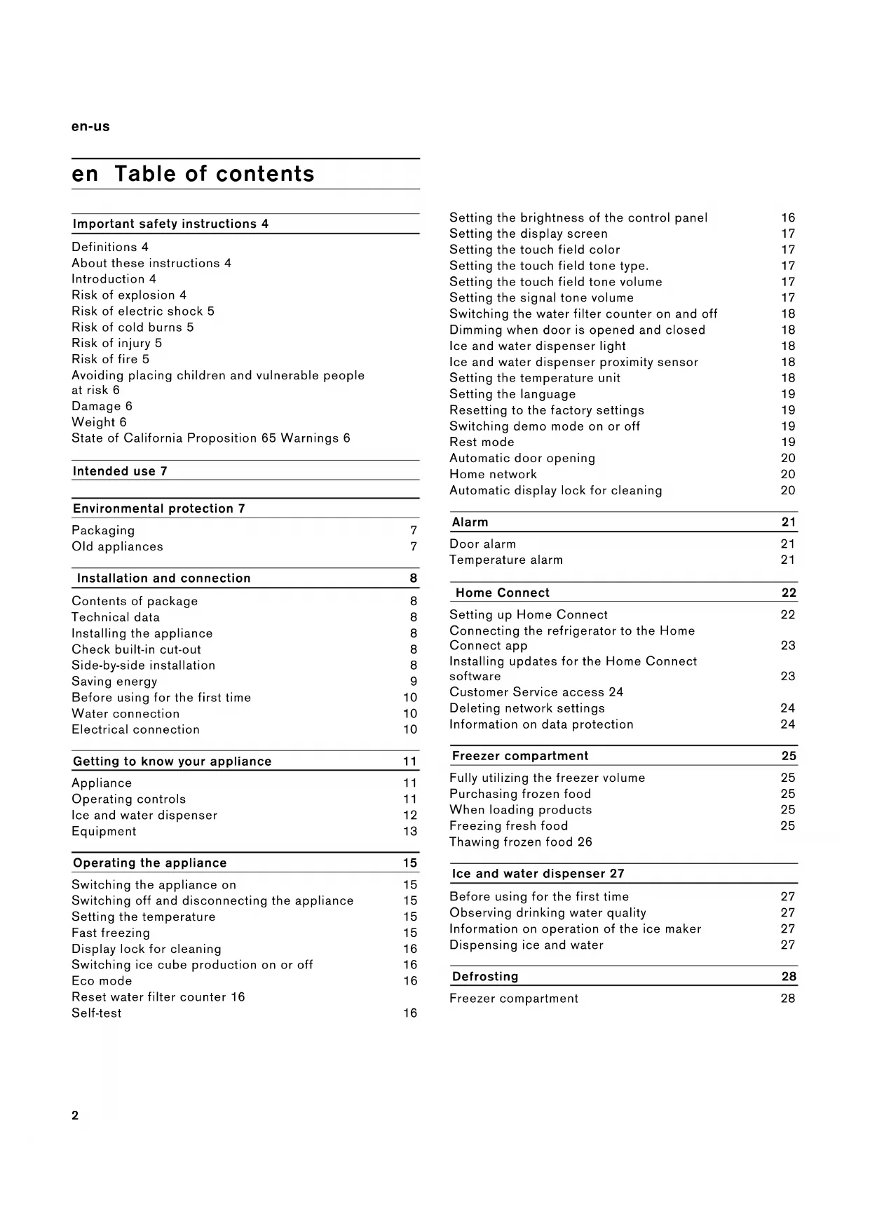 Operating the appliance 15 Switching the appliance on 15 Switching off and disconnecting the appliance 15 Setting the temperature 15 Fast freezing 15 Display lock for cleaning 16 Switching ice cube production on or off 16 Eco mode 16 Reset water filter counter 16 Self-test 16 Setting the brightness of the control panel 16 Setting the display screen 17 Setting the touch field color 17 Setting the touch field tone type. 17 Setting the touch field tone volume 17 Setting the signal tone volume 17 Switching the water filter counter on and off 18 Dimming when door is opened and closed 18 Ice and water dispenser light 18 Ice and water dispenser proximity sensor 18 Setting the temperature unit 18 Setting the language 19 Resetting to the factory settings 19 Switching demo mode on or off 19 Rest mode 19 Automatic door opening 20 Home network 20 Automatic display lock for cleaning 20