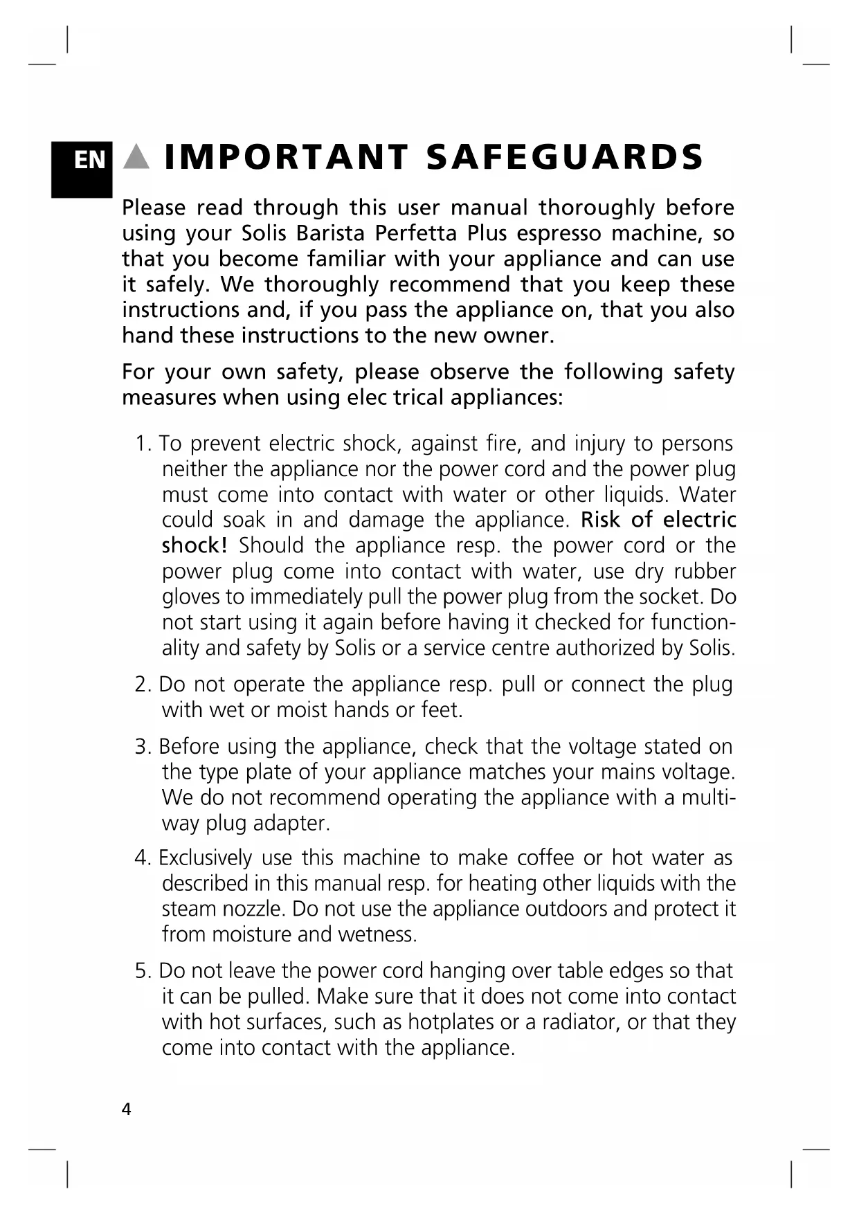 IMPORTANT SAFEGUARDS Please read through this user manual thoroughly before using your Solis Barista Perfetta Plus espresso machine, so that you become familiar with your appliance and can use it safely. We thoroughly recommend that you keep these instructions and, if you pass the appliance on, that you also hand these instructions to the new owner. For your own safety, please observe the following safety measures when using elec trical appliances: