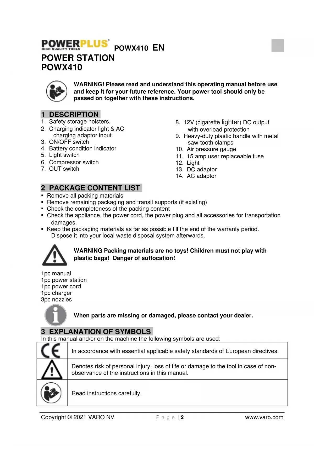 Read instructions carefully.POWX410 EN Copyright © 2021 VARO NV P a g e | 3 www.varo.com