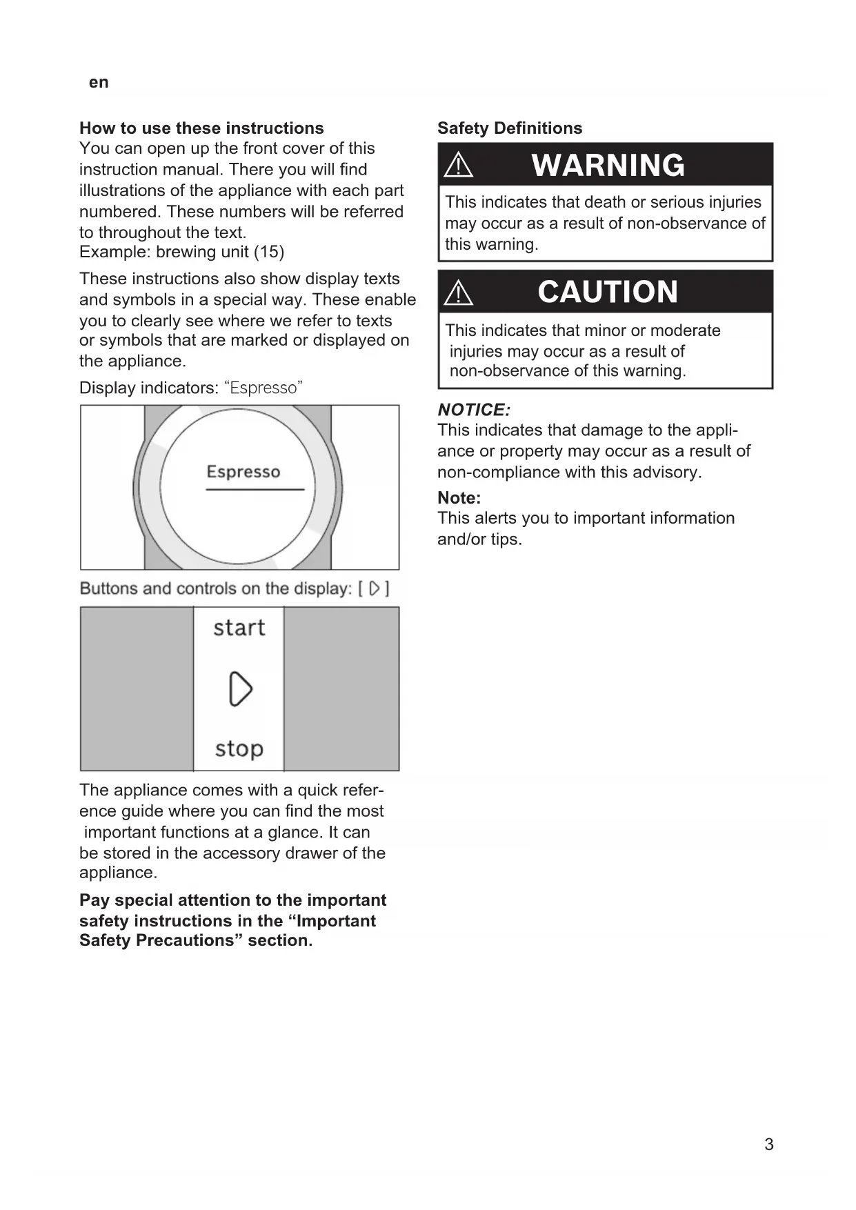 CAUTION This indicates that minor or moderate injuries may occur as a result of non-observance of this warning. NOTICE: This indicates that damage to the appli- ance or property may occur as a result of non-compliance with this advisory. Note: This alerts you to important information and/or tips. How to use these instructions You can open up the front cover of this instruction manual. There you will nd illustrations of the appliance with each part numbered. These numbers will be referred to throughout the text. Example: brewing unit (15) These instructions also show display texts and symbols in a special way. These enable you to clearly see where we refer to texts or symbols that are marked or displayed on the appliance. Display indicators: “Espresso” Espresso Buttons and controls on the display: C The appliance comes with a quick refer- ence guide where you can nd the most important functions at a glance. It can be stored in the accessory drawer of the appliance. Pay special attention to the important safety instructions in the “Important Safety Precautions” section.4 en Important Safety Precautions When using electrical appliances, basic safety precautions should always be followed, including the following:1. Please read and follow the operating instructions carefully and keep them for later reference. If the unit is transferred to another party, please be sure to include these instructions.2. Do not touch hot surfaces. Use handles or knobs.3. Be sure that all components are assembled and fastened properly.4. To protect against re, electric shock and injury to persons, do not immerse cord, plugs, or body in water or in any other liquid. See use and care manual for cleaning.5. Close supervision is necessary when the appliance is used by or near children.6. Unplug from outlet when not in use and before cleaning. Allow to cool before putting on or taking o parts, and before cleaning the appliance.7. Do not operate any appliance with a damaged cord or plug or after it malfunctions, or has been damaged in any manner. Return appliance to the nearest authorized service facility.8. The use of accessories attachments not recommended by the appliance manufacturer may result in re, electric shock or injury to persons.9. Do not use outdoors or in a damp area.10. Do not let cord hang over edge of table or countertop, or touch hot surfaces.11. Do not place unit or components on or near a cooktop or range, or in a heated oven.12. Always attach plug to appliance rst, then plug cord into the wall outlet. To disconnect, turn control to “o”, then remove plug from wall outlet.13. Do not use appliance for anything other than its intended use.14. Save these Instructions. State of California Proposition 65 Warnings