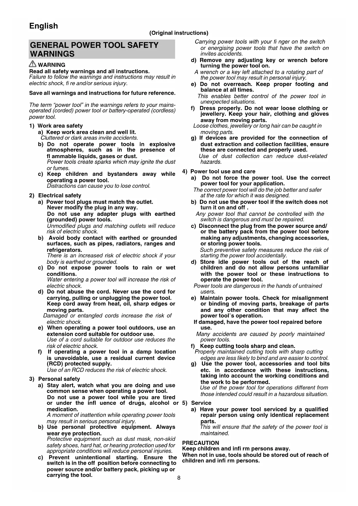 a) Have your power tool serviced by a qualifi ed repair person using only identical replacement parts. This will ensure that the safety of the power tool is maintained. PRECAUTION Keep children and infi rm persons away. When not in use, tools should be stored out of reach of children and infi rm persons.