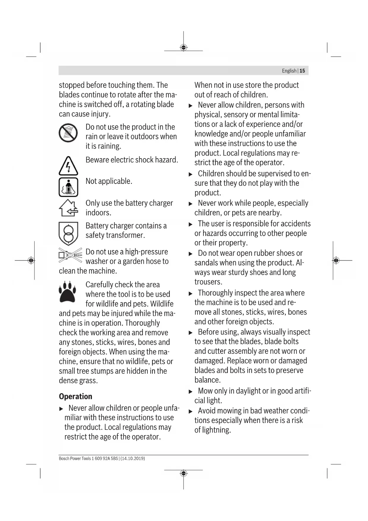 to the product when operat- ing. Caution: Do not touch rotat- ing blades. Sharp blade(s). Beware of severing toes or fingers. Switch off and remove isol- ator switch before adjusting, cleaning and before leaving the product unattended for any period. Not applicable. Wait until all machine com- ponents have completely 1 609 92A 5BS | (14.10.2019) Bosch Power ToolsEnglish | 15 stopped before touching them. The blades continue to rotate after the ma- chine is switched off, a rotating blade can cause injury. Do not use the product in the rain or leave it outdoors when it is raining. Beware electric shock hazard. Not applicable. Only use the battery charger indoors. Battery charger contains a safety transformer. Do not use a high-pressure washer or a garden hose to clean the machine. Carefully check the area where the tool is to be used for wildlife and pets. Wildlife and pets may be injured while the ma- chine is in operation. Thoroughly check the working area and remove any stones, sticks, wires, bones and foreign objects. When using the ma- chine, ensure that no wildlife, pets or small tree stumps are hidden in the dense grass. Operation u Never allow children or people unfa- miliar with these instructions to use the product. Local regulations may restrict the age of the operator. When not in use store the product out of reach of children. u Never allow children, persons with physical, sensory or mental limita- tions or a lack of experience and/or knowledge and/or people unfamiliar with these instructions to use the product. Local regulations may re- strict the age of the operator. u Children should be supervised to en- sure that they do not play with the product. u Never work while people, especially children, or pets are nearby. u The user is responsible for accidents or hazards occurring to other people or their property. u Do not wear open rubber shoes or sandals when using the product. Al- ways wear sturdy shoes and long trousers. u Thoroughly inspect the area where the machine is to be used and re- move all stones, sticks, wires, bones and other foreign objects. u Before using, always visually inspect to see that the blades, blade bolts and cutter assembly are not worn or damaged. Replace worn or damaged blades and bolts in sets to preserve balance. u Mow only in daylight or in good artifi- cial light. u Avoid mowing in bad weather condi- tions especially when there is a risk of lightning. Bosch Power Tools 1 609 92A 5BS | (14.10.2019)16 | English u Avoid operating the machine in wet grass, where feasible. u Walk, never run. u Never operate the machine with de- fective guards or shields, or without safety devices, for example deflect- ors and/or grass catchers in place. u We would advise you to wear ear protection for your own conveni- ence. u Never operate the product when you are tired, ill or under the influence of alcohol, drugs or medicine. u Working on banks can be dangerous: − Do not mow on excessively steep slopes. − Always be sure of your footing on slopes or wet grass. − Mow across the face of slopes never up and down. − Exercise extreme caution when changing direction on slopes. u Use extreme caution when stepping back or pulling the machine towards you. u Never mow by pulling the mower to- wards you. u Wait until the blades stop if the ma- chine has to be tilted for transporta- tion when crossing surfaces other than grass and when transporting the machine to and from the area to be mowed. u Do not tilt the machine when starting or switching on the motor. u Switch on the motor according to the instructions with feet well away from rotating parts. u Do not put hands or feet near or un- der rotating parts. u Always stand clear of the discharge zone when operating the machine. u Never pick up or carry the machine while the motor is running. u When storing, make sure that all 4 wheels of the garden tool stand on the ground/floor. u Only lift the garden tool with the car- rying handle. Use the carrying handle with care. u Do not modify the machine. Unau- thorized modifications can impair the safety of your machine, lead to increased noise and vibrations, and poor performance. Leaf Collect The leaf collect blade has been de- signed to allow you to pick up autumn leaves from your lawn. In order for this functionality to work within optimal parameters, please note the following: – Only collect leaves with the ma- chine set at maximum cutting height. – Collect leaves from your lawn only. – Before collecting leaves inspect the area where the machine is to be used and keep people, pets, glass structures and cars away from use. 1 609 92A 5BS | (14.10.2019) Bosch Power ToolsEnglish | 17 Remove the isolator switch: – Whenever you leave the machine. – Before clearing a blockage. – Before checking, cleaning or work- ing on the machine. – After striking a foreign object. In- spect the machine for damage and change the blade as necessary. – If the machine starts to vibrate ab- normally (check immediately). Maintenance u Always wear gardening gloves when handling or working near the sharp blades. u Keep all nuts, bolts and screws tight to ensure safe working with the product. u Check the grass bag frequently for wear or deterioration. u Check the grass catcher frequently for wear or deterioration. u Inspect the product and replace worn or damaged parts for safety. u Ensure replacement cutting means of the right type are used. u Ensure replacement parts fitted are Bosch-approved. u Before storing, make sure that the product is clean and free of residue. If necessary, clean with a soft dry brush. Safety Instructions and Recommendations for Optimal Handling of the Battery u Ensure the garden tool is switched off and the isolator switch is in the off position before the inserting bat- tery. Inserting the battery pack into machines that have the switch on can cause accidents. u Use only Bosch battery packs intended specifically for the machine. Use of any other battery pac