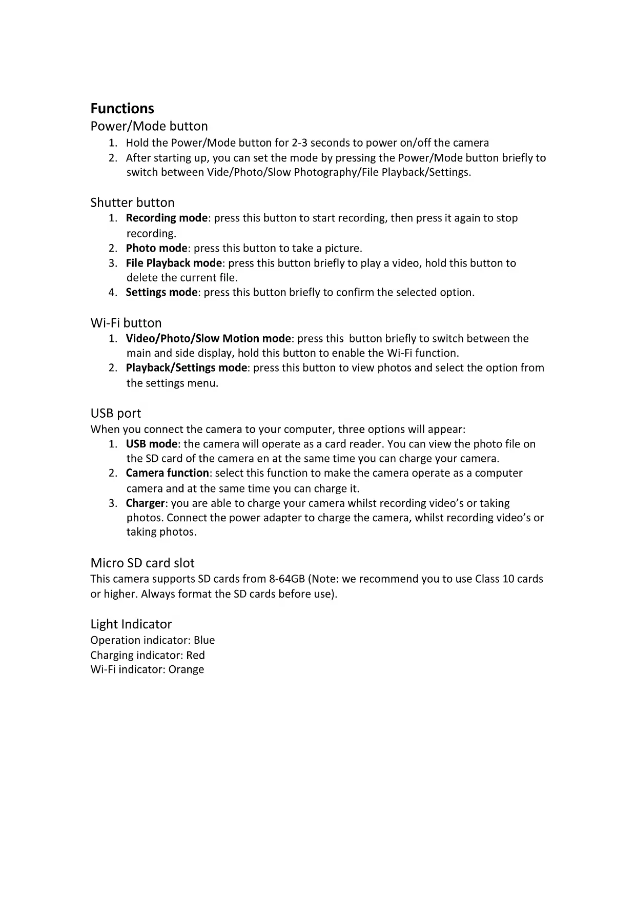 photos. Connect the power adapter to charge the camera, whilst recording video’s or taking photos. Micro SD card slot This camera supports SD cards from 8-64GB (Note: we recommend you to use Class 10 cards or higher. Always format the SD cards before use). Light Indicator Operation indicator: Blue Charging indicator: Red Wi-Fi indicator: OrangeMain functions of the camera