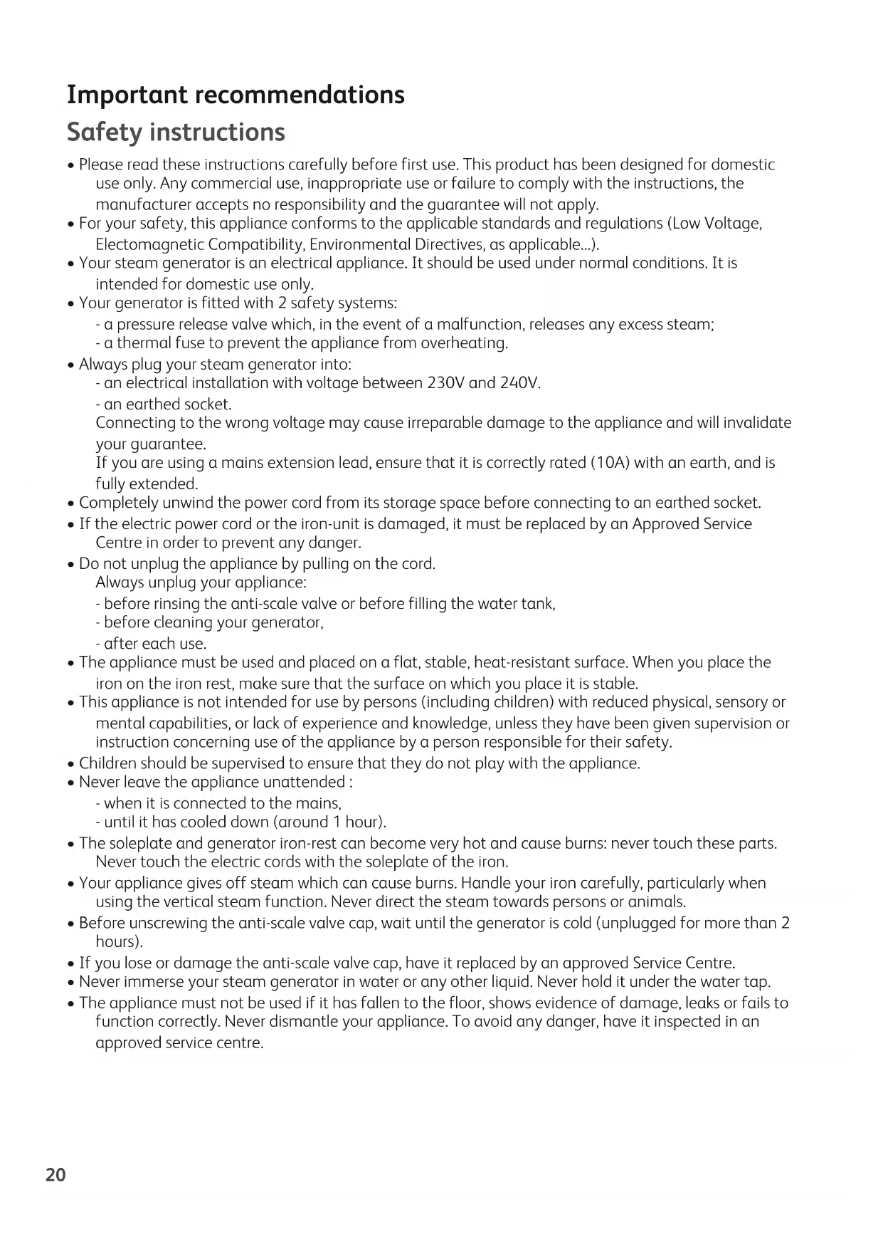 - Your steam generator is an electrical appliance. It should be used under normal conditions. It is intended for domestic use only.