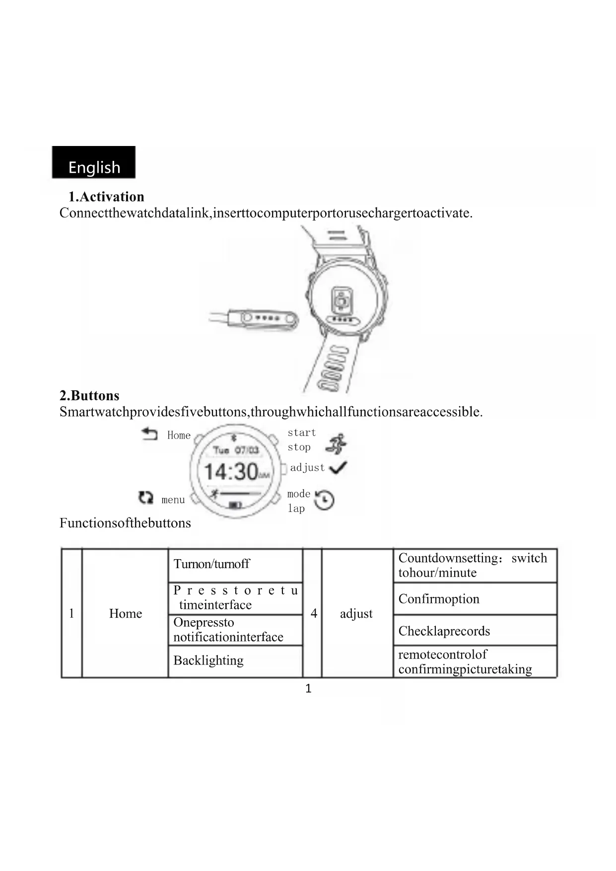adjust Count down setting:switch to hour/ minute Presstoreturntothe time interface Confirm option One press to notification interface Check lap records Backlighting remote control of confirming picture taking Home menu start stop adjust mode lap English2
