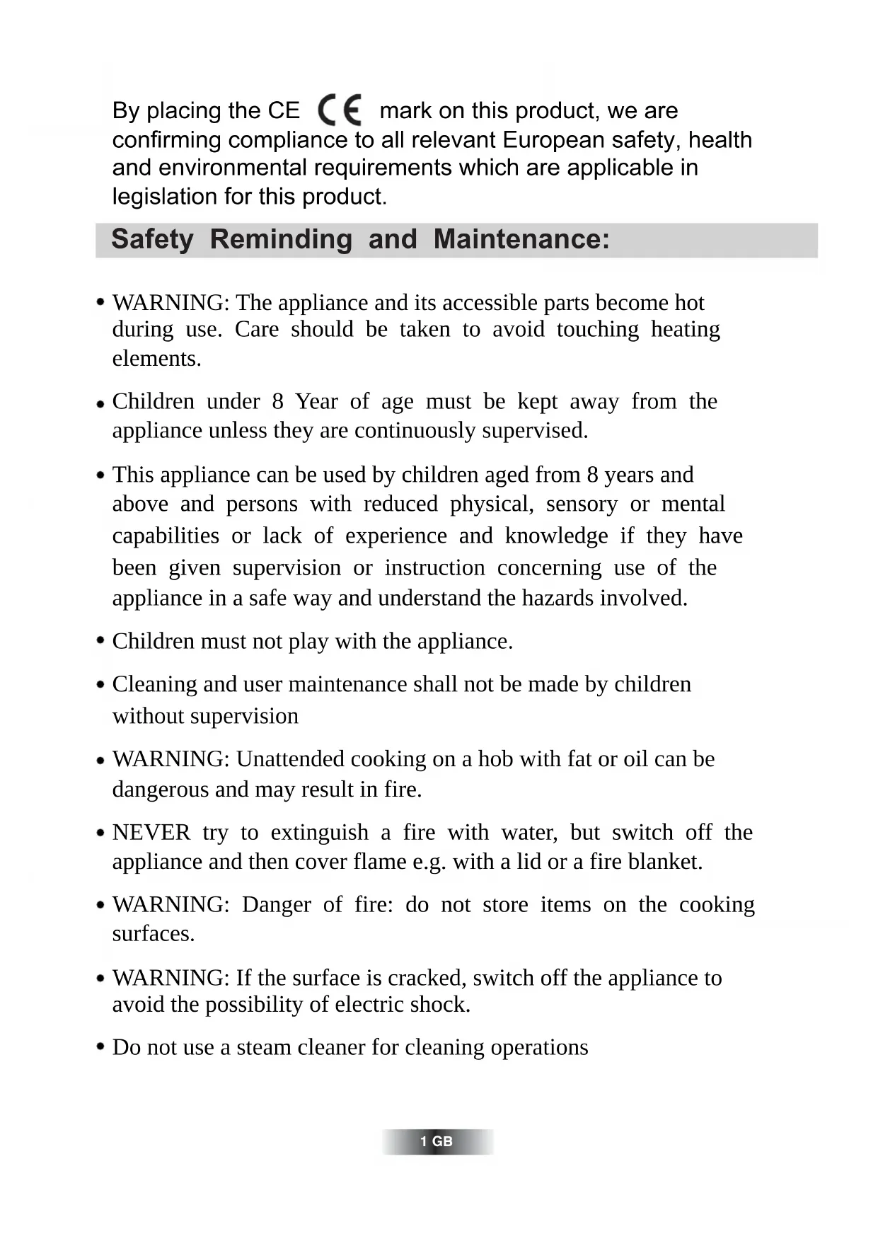 during use. Care should be taken to avoid touching heating elements. Children under 8 Year of age must be kept away from the appliance unless they are continuously supervised. This appliance can be used by children aged from 8 years and above and persons with reduced physical, sensory or mental capabilities or lack of experience and knowledge if they have been given supervision or instruction concerning use of the appliance in a safe way and understand the hazards involved. Children must not play with the appliance. Cleaning and user maintenance shall not be made by children without supervision