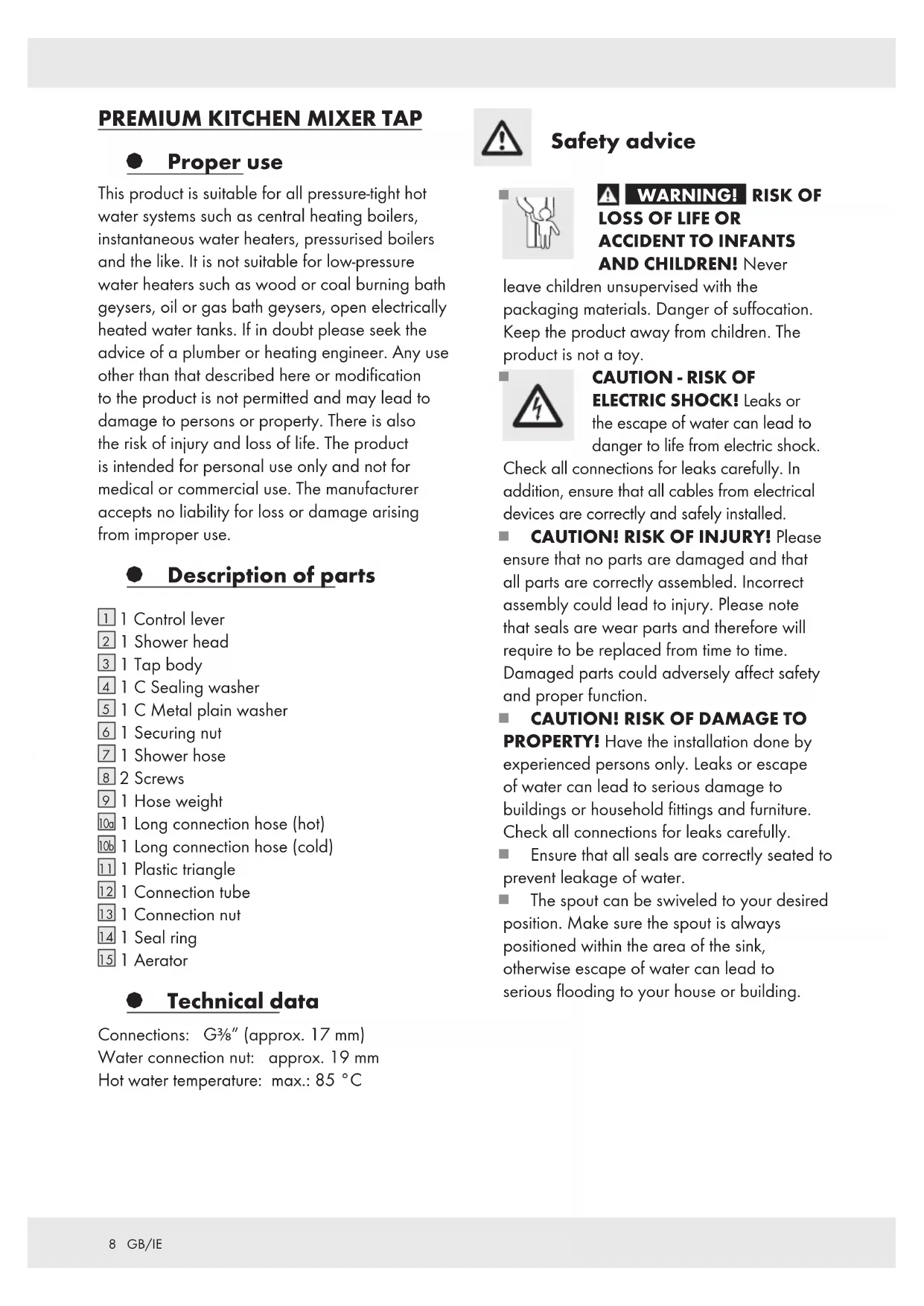 at regular intervals and remove lime deposits or foreign bodies. Non-observance of the above care advice can be expected to result in damage to the surface of the fittings. In this event your rights under the warranty may be invalidated.10 GB/IE § Disposal The packaging is made entirely of recyclable materials, which you may dispose of at local recycling facilities. Contact your local refuse disposal authority for more details of how to dispose of your worn-out product. § Information § Potability of mains water Find out about the potability of your mains water supply. Your local water authority or water supply company will be able to inform you. The following general recommendations apply to the potability of the water from your pipework: Let the water run freely for a short time if it has been stagnating in the pipework for more than four hours. Do not use any of this stagnant water in the preparation of food or for drinking. This applies particularly as far as babies and infants are concerned. Failure to observe this advice may result in risks to health. Fresh water can be readily distinguished from stagnant as fresh water is noticeably cooler. Do not use stagnant water from chromium- plated pipework for the preparation of food or for drinking or for personal hygiene if you are allergic to nickel. This water may contain high quantities of nickel and trigger an allergic reaction. Do not use water from lead pipework for preparing food or drink for babies or infants. Do not use it for preparing food or drink during pregnancy. Lead dissolves in drinking water and is particularly damaging to the health of babies and young children. § Warranty The device has been manufactured to strict quality guidelines and meticulously examined before delivery. In the event of product defects you have legal rights against the retailer of this product. Your legal rights are not limited in any way by our warranty detailed below. The warranty for this device is 5 years from the date of purchase. Should this device show any fault in materials or manufacture within 5 years from the date of purchase, we will repair or replace it - at our choice - free of charge to you. The warranty period begins on the date of purchase. Please keep the original sales receipt in a safe location. This document is required as your proof of purchase. This warranty becomes void if the device has been damaged or improperly used or maintained. The warranty applies to faults in material or manufacture. This warranty does not cover product parts subject to normal wear, thus possibly considered consumables (e.g. batteries) or for damage to fragile parts, e.g. switches, rechargeable batteries or glass parts.11 FR/BE