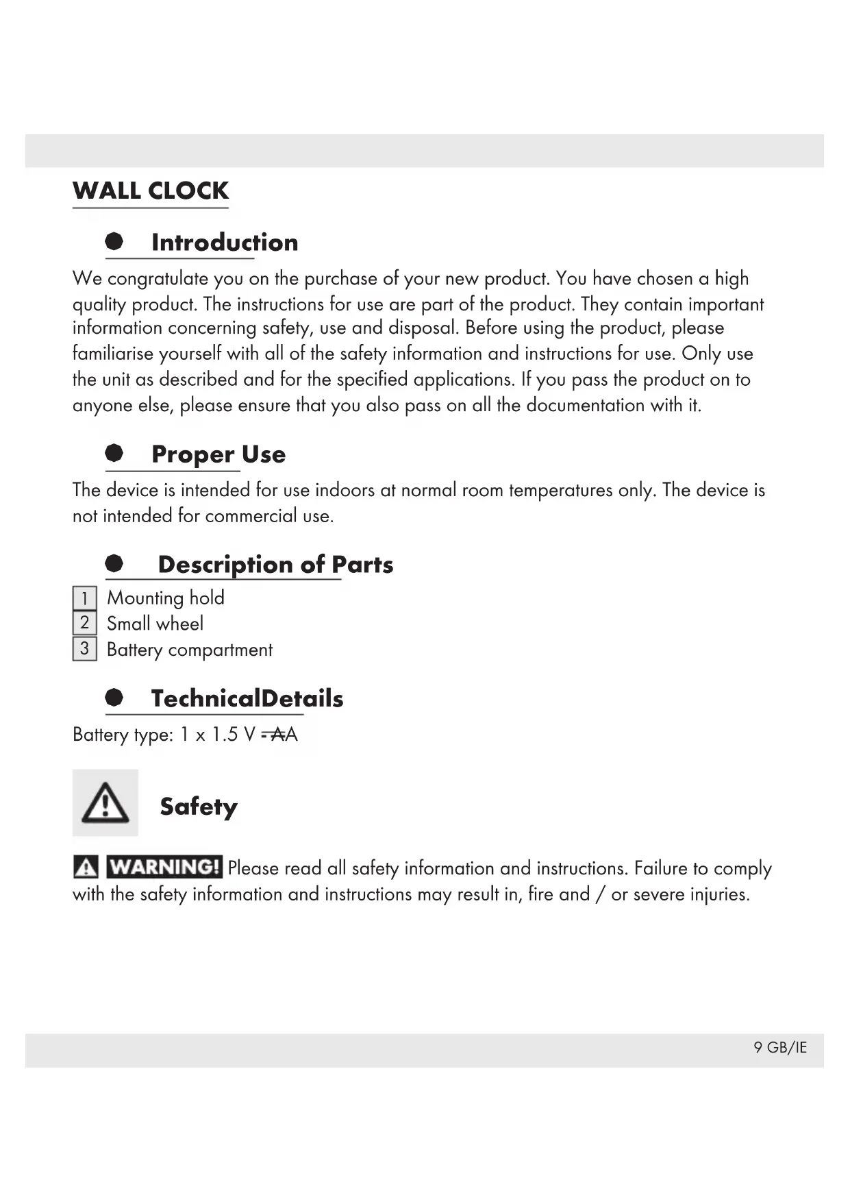 DANGER TO LIFE! Batteries can be swallowed, which may represent a danger to life. If a battery has been swallowed, medical help is required immediately. Do not use the device if it is damaged. Repairs should only be carried out by specialist personnel. Battery Safety Information WARNING! DANGER TO LIFE! Batteries are not intended for children. If accidentally swallowed seek immediate medical attention. Caution! EXPLOSION HAZARD! Never recharge non-rechargeable batteries and do not short-circuit and / or open any batteries. Never throw batteries into fire or water. Do not exert mechanical loads to batteries.11 GB/IE Risk of battery leaking In the event of a battery leak, immediately remove it from the device to prevent damage. Avoid contact with the skin, eyes and mucous membranes. In the event of contact with battery acid, thoroughly flush the affected area with clean water and seek immediate medical attention. Avoid extreme conditions and temperatures which may impact batteries, e.g. radiators, direct sunlight. Remove the battery from the device if it is not going to be used for extended periods. Risk of property damage Use only the recommended battery type! When inserting the battery ensure the correct polarity! If necessary, clean the battery and device contacts before inserting the battery. Promptly remove a drained battery from the product. § Preparing the product for use Remove the battery insulation strip from between the battery and the contact. Please see fig. B for replacing battery. § Operation Setting the time To set the time, turn the small wheel