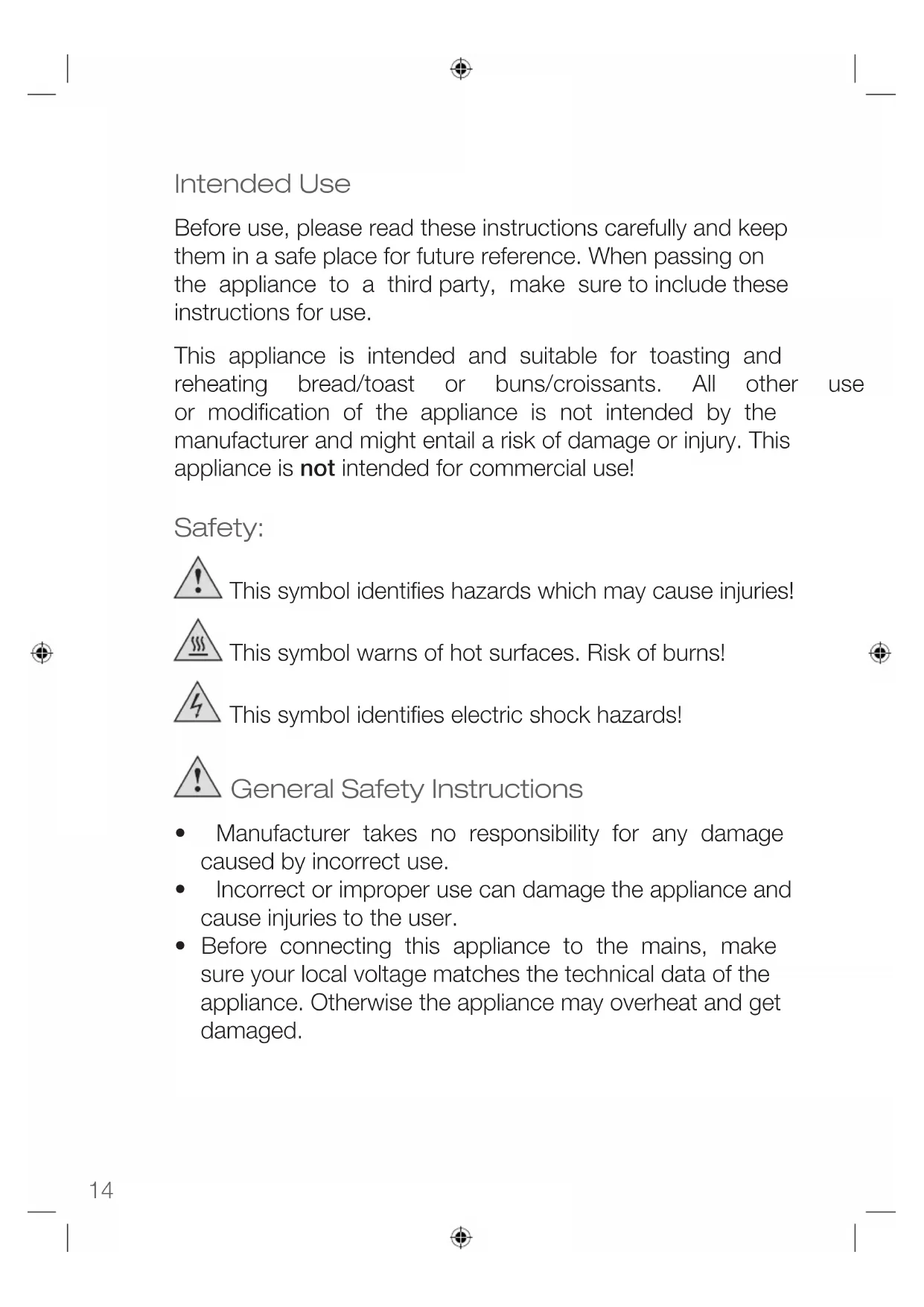 Attention: Toasted bread can be very hot. Let it cool down or use potholders to handle it. If a slice of bread should get stuck during the toasting process, unplug the appliance and let it cool down completely, before trying to remove it. Do not use any sharp metalobjectstodoso.Duringoperation,breadcrumbsare fallingdownontothecrumptray(7),makesuretocleaniton a regular basis. Use of the Bun Rack Always use the bun rack (8) for toasting/reheating buns/croissants. Never put them directly into the bread slot. To avoid any heat accumulation, never completely cover the bun warmer. In case of doubt, only place one bun/croissant on the bun warmer. 1.Unfold the bun warmer (8) and place it on top of the appliance. 2.Placeonebun/croissantontothebunwarmer(8). 3.Setthebrowningcontrol(6)toalowtomediumlevel(1-3) by turning it into the resp. direction. 4.Pressdownthetoastinglever(2)untilitlocksinplace,the indicatorlightofthestopbutton(3)lightsup.Oncethe required browning degree has been reached, the toaster switches off automatically. The browning degree also depends on the size and freshness of the product. 5.Carefully turn the bun/croissant over and switch the toasteronagain.Careful:Toastedbreadcanbeveryhot. 6.To interrupt the toasting cycle before automatic cut-off, presstheStopbutton(3).22 7.Make sure to remove the bun warmer (8) from the appliance after use. We recommend to use a low to medium browning level (1 – 3), in order to avoid a potential damage to the appliance and/or any heat accumulation. The removable bun warmer must be removed after each reheating process. Never insert or use it during the regular toasting process. Reheating Function With this function, you can reheat bread which was toasted earlier,simplyinsertthebreadintothebreadslots(1),press downthetoastinglever(2)andthenpressthereheatbutton (5).BothindicatorlightsoftheStopbutton(3)aswellasof thereheatbutton(5)lightup.Thereheatingprocessstarts. The toaster automatically stops after several seconds. Thepre-setbrowninglevelhasnoinuenceonthereheat cycle. Defrost Function With this function you can toast frozen bread. To activate the defrost function insert the bread into the bread slots (1),chooseyourdesiredbrowninglevel,pressdownthe toastinglever(2)untilitlocksinplaceandthenpressthe defrostbutton(4).BothindicatorlightsoftheStopbutton (3)aswellasofdefrostbutton(4)lightup.Thepre-set browningleveldeterminesthedefrost/countdowntime. All functions can be interrupted by pressing the Stop button (3).Instruction Manual ENGLISH
